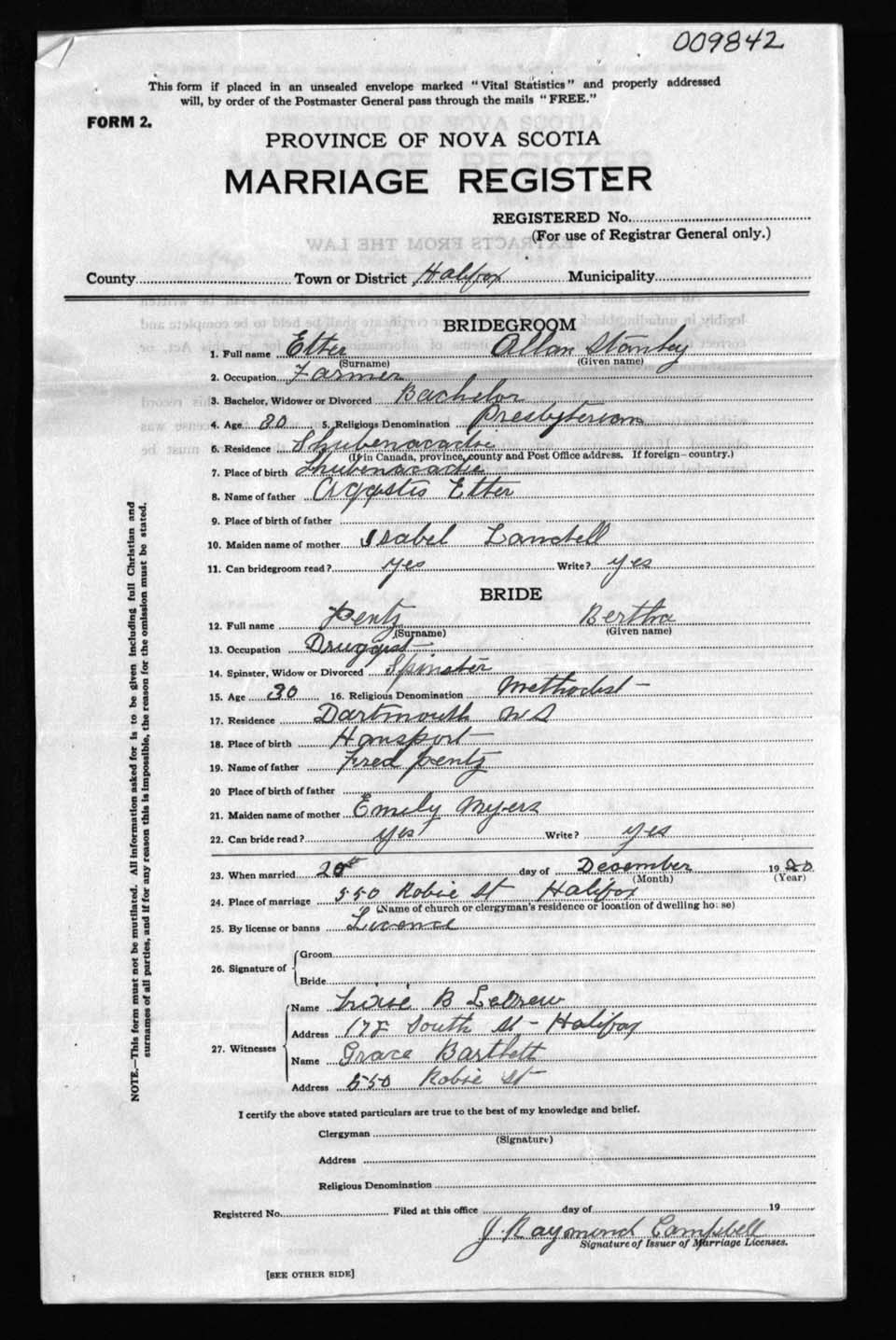Registration: Year: 1920 number: 9842