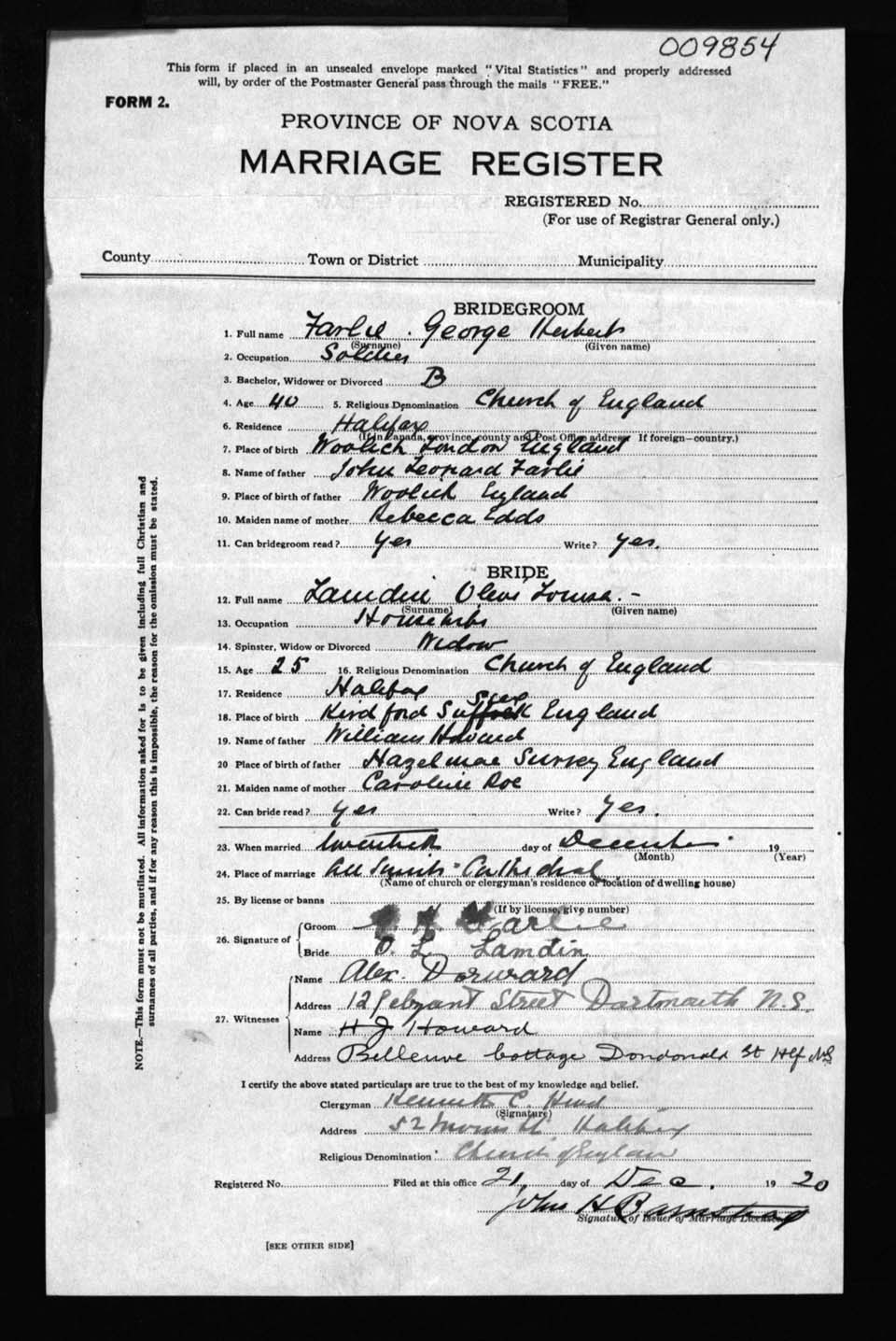 Registration: Year: 1920 number: 9854