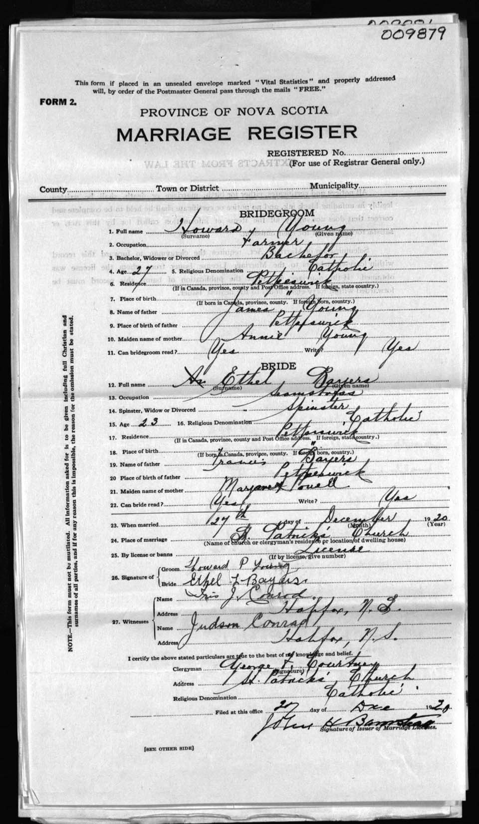 Registration: Year: 1920 number: 9879