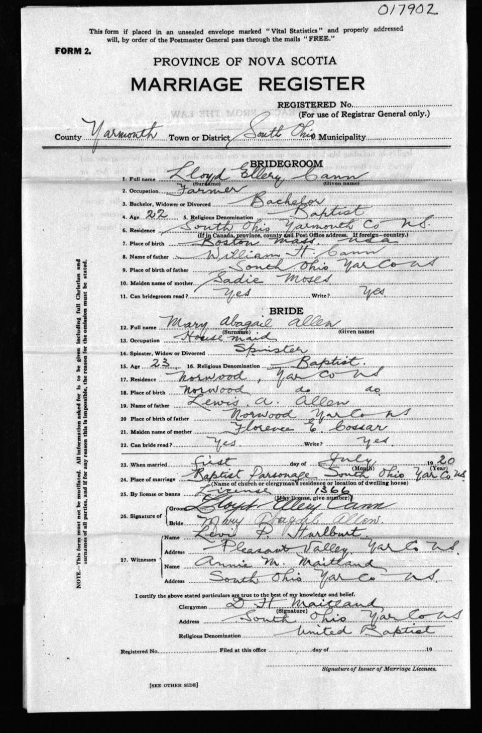 Registration: Year: 1920 number: 17902