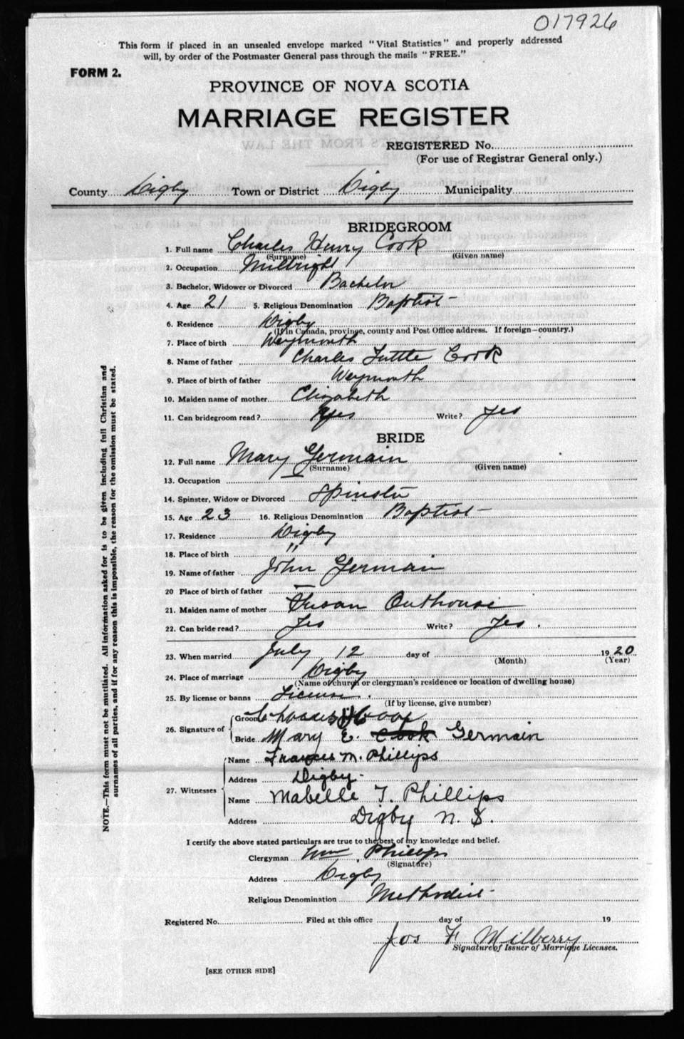Registration: Year: 1920 number: 17926