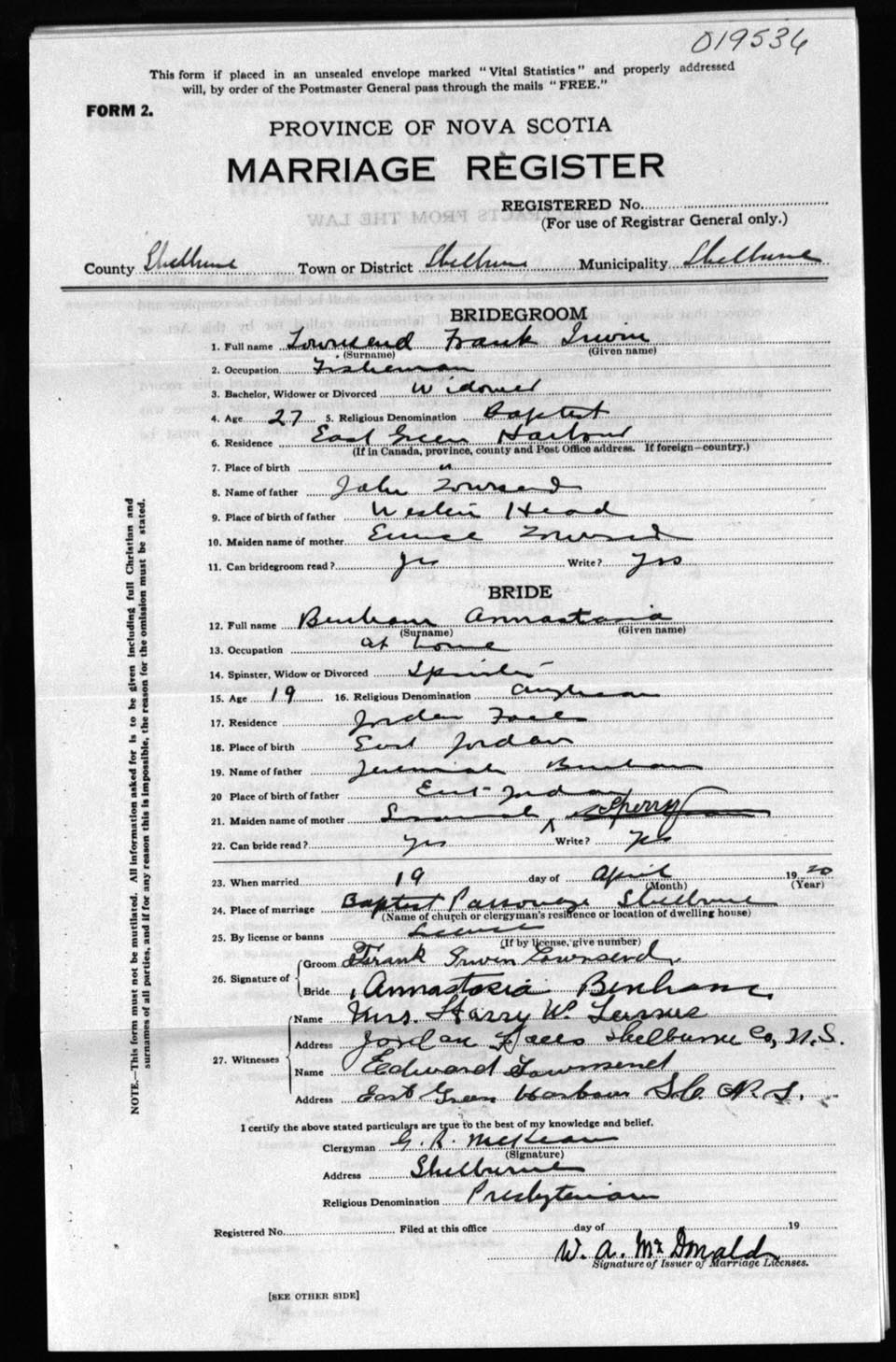 Registration: Year: 1920 number: 19536
