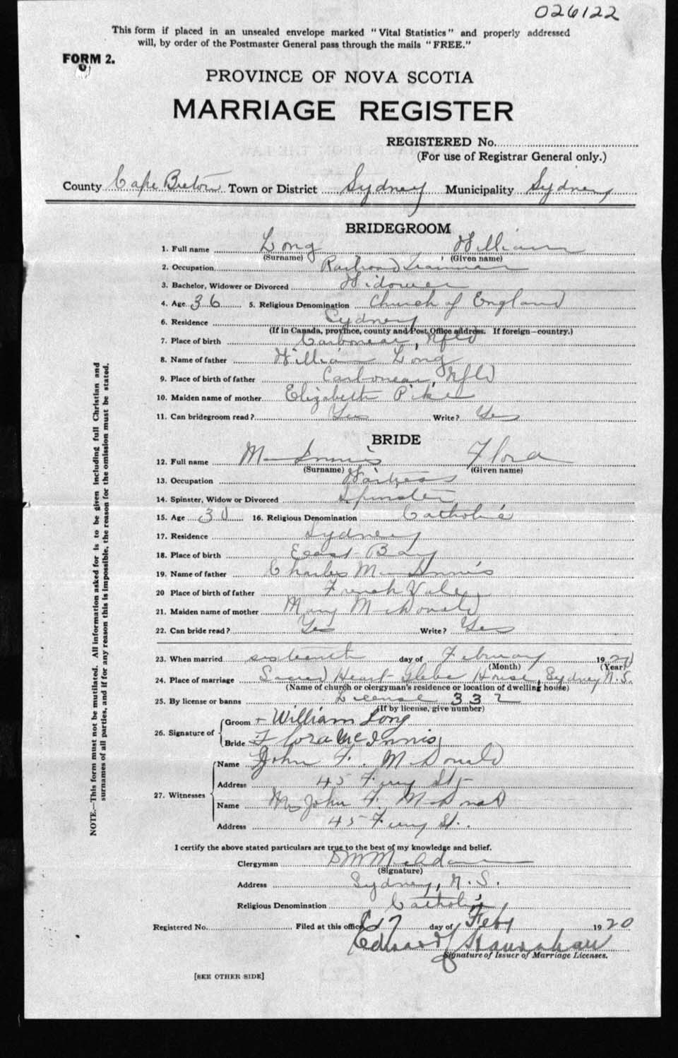 Registration: Year: 1920 number: 26122
