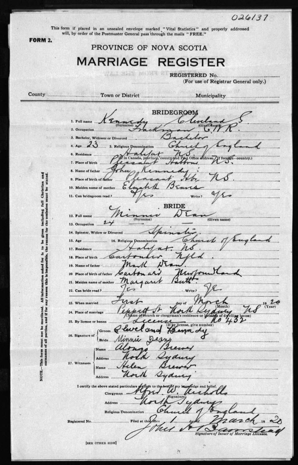 Registration: Year: 1920 number: 26137