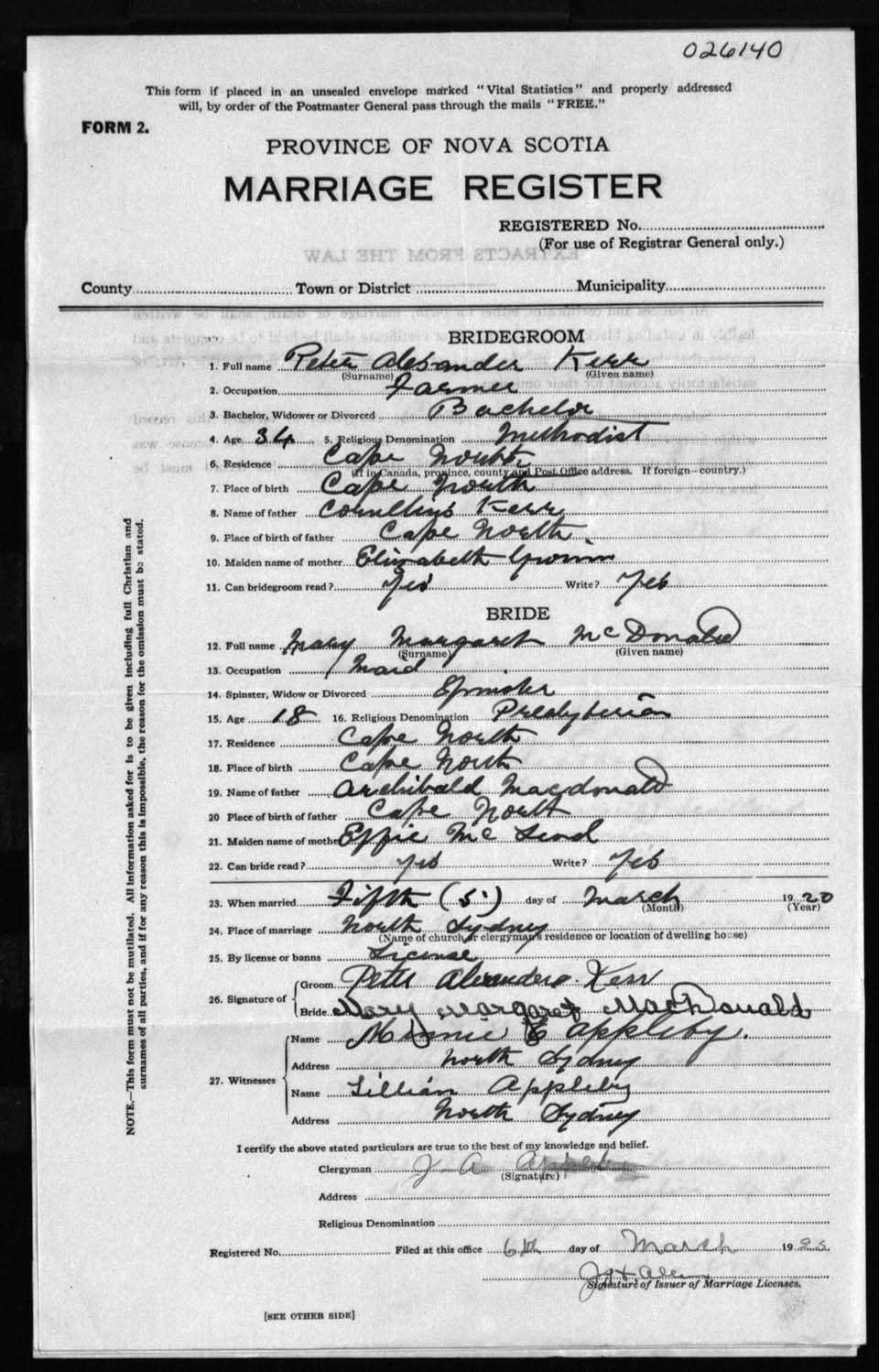 Registration: Year: 1920 number: 26140