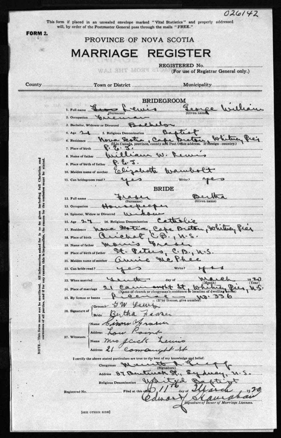 Registration: Year: 1920 number: 26142
