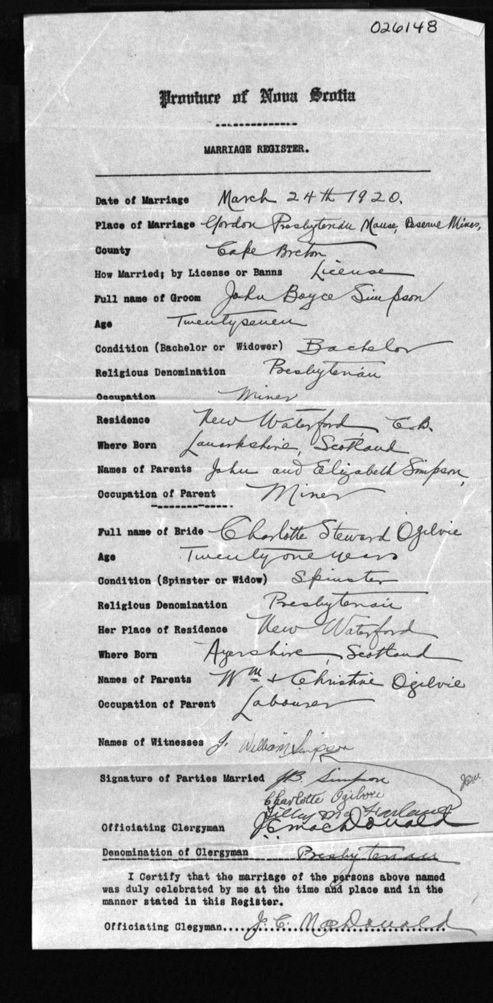 Registration: Year: 1920 number: 26148