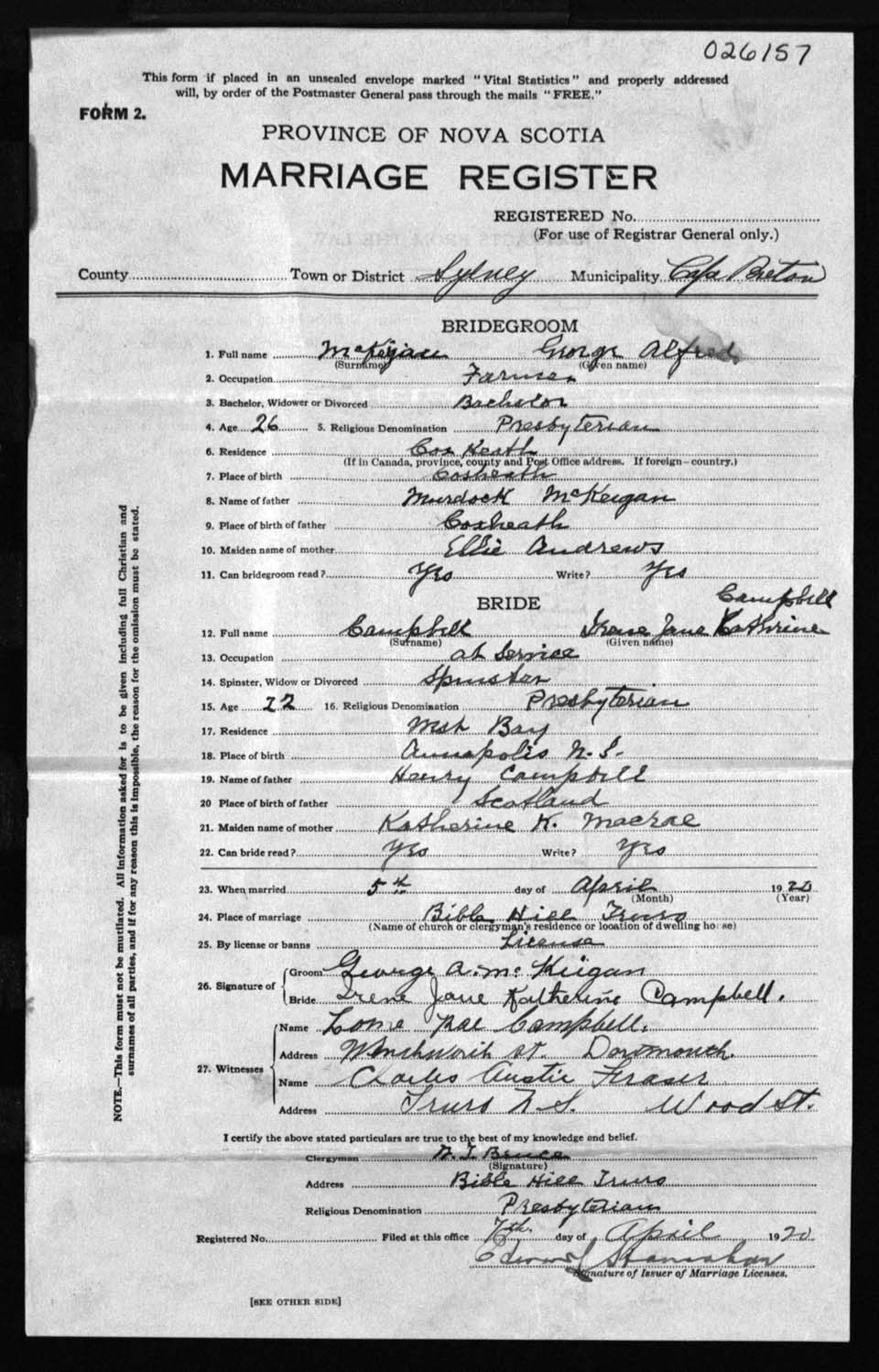 Registration: Year: 1920 number: 26157