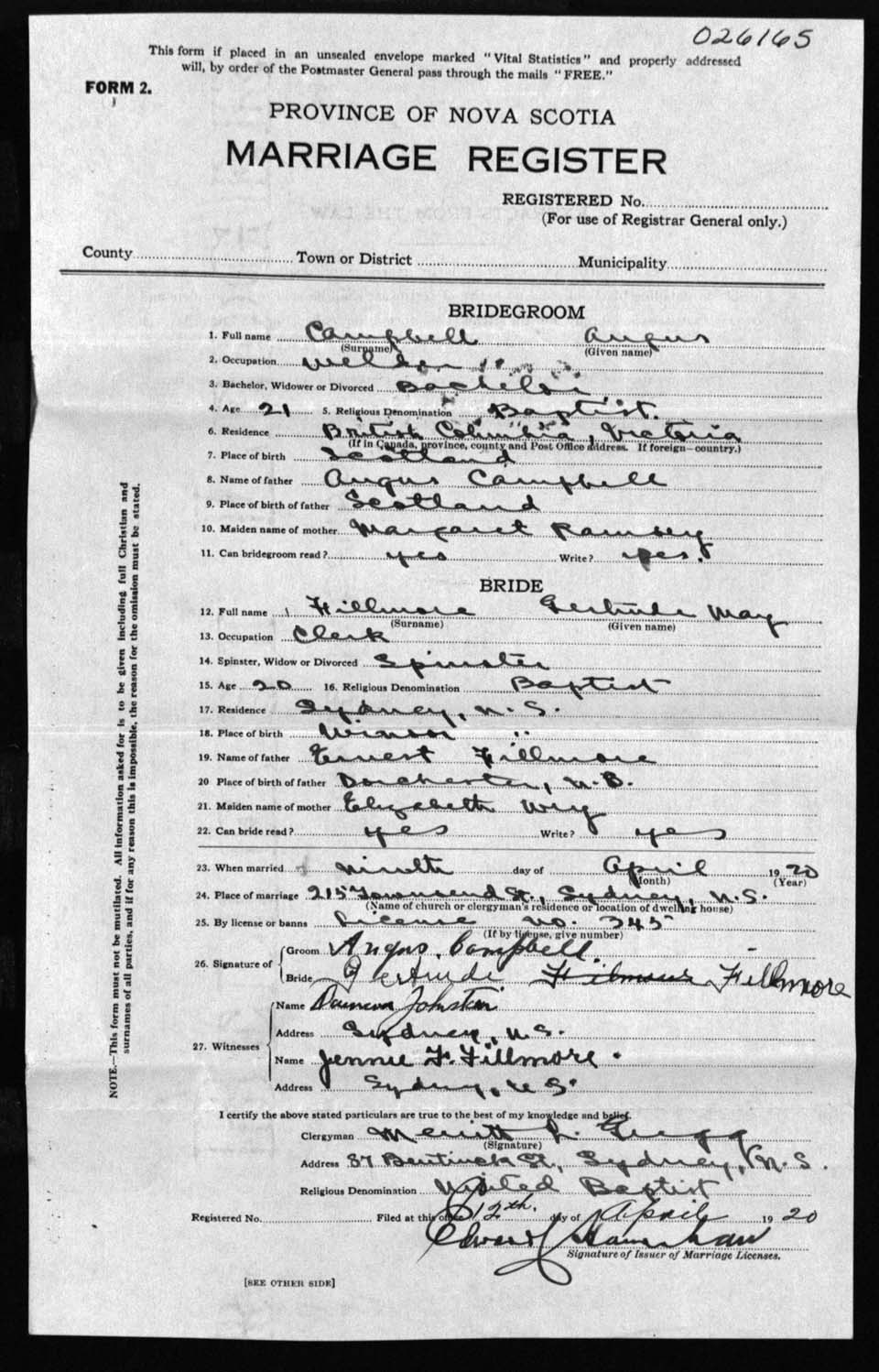 Registration: Year: 1920 number: 26165
