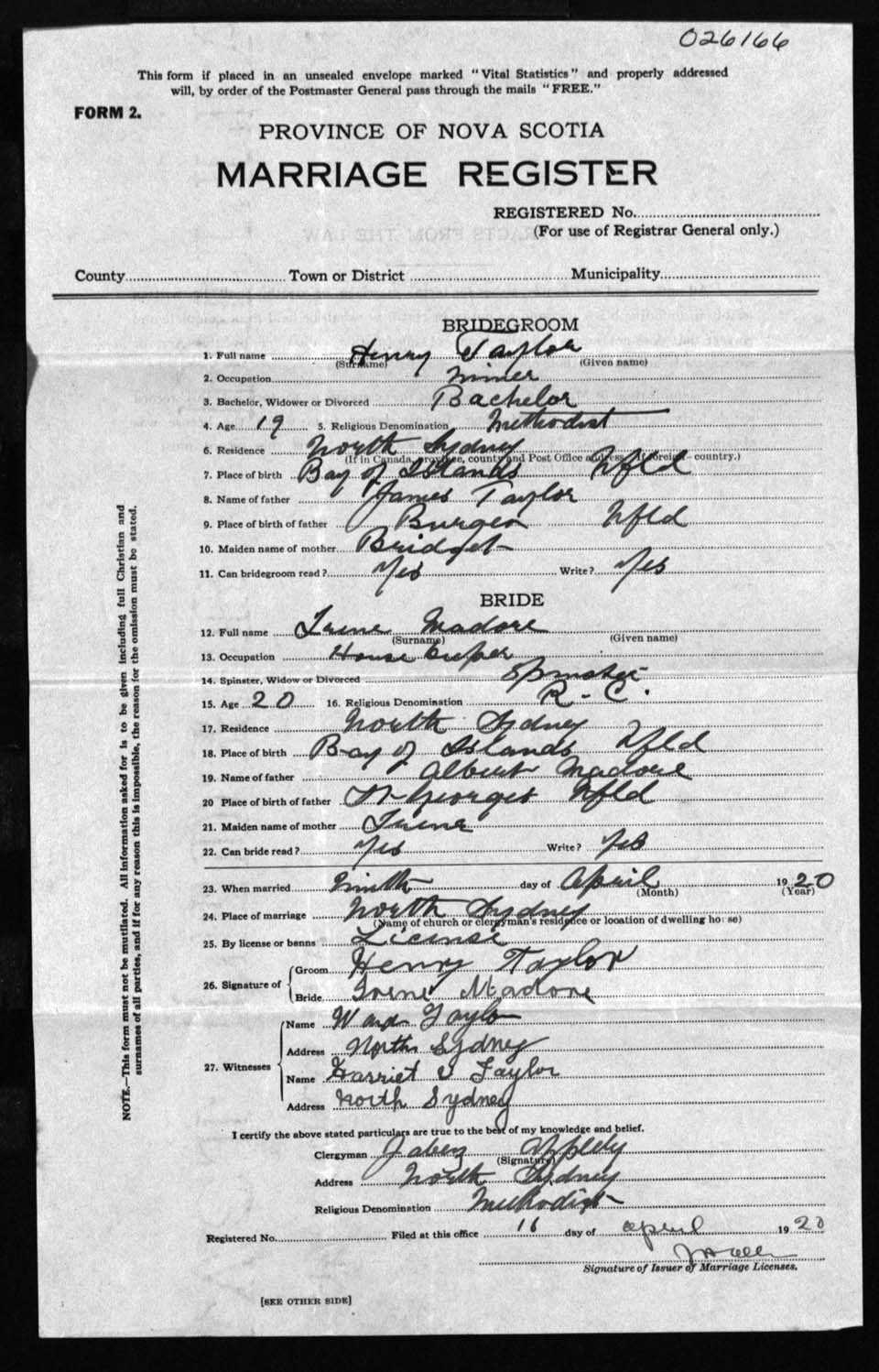 Registration: Year: 1920 number: 26166