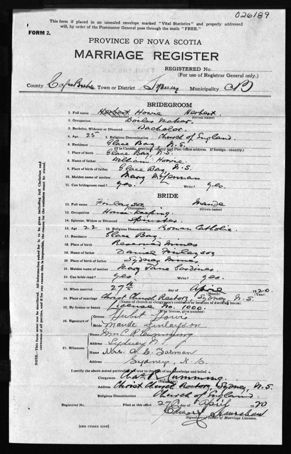 Registration: Year: 1920 number: 26189