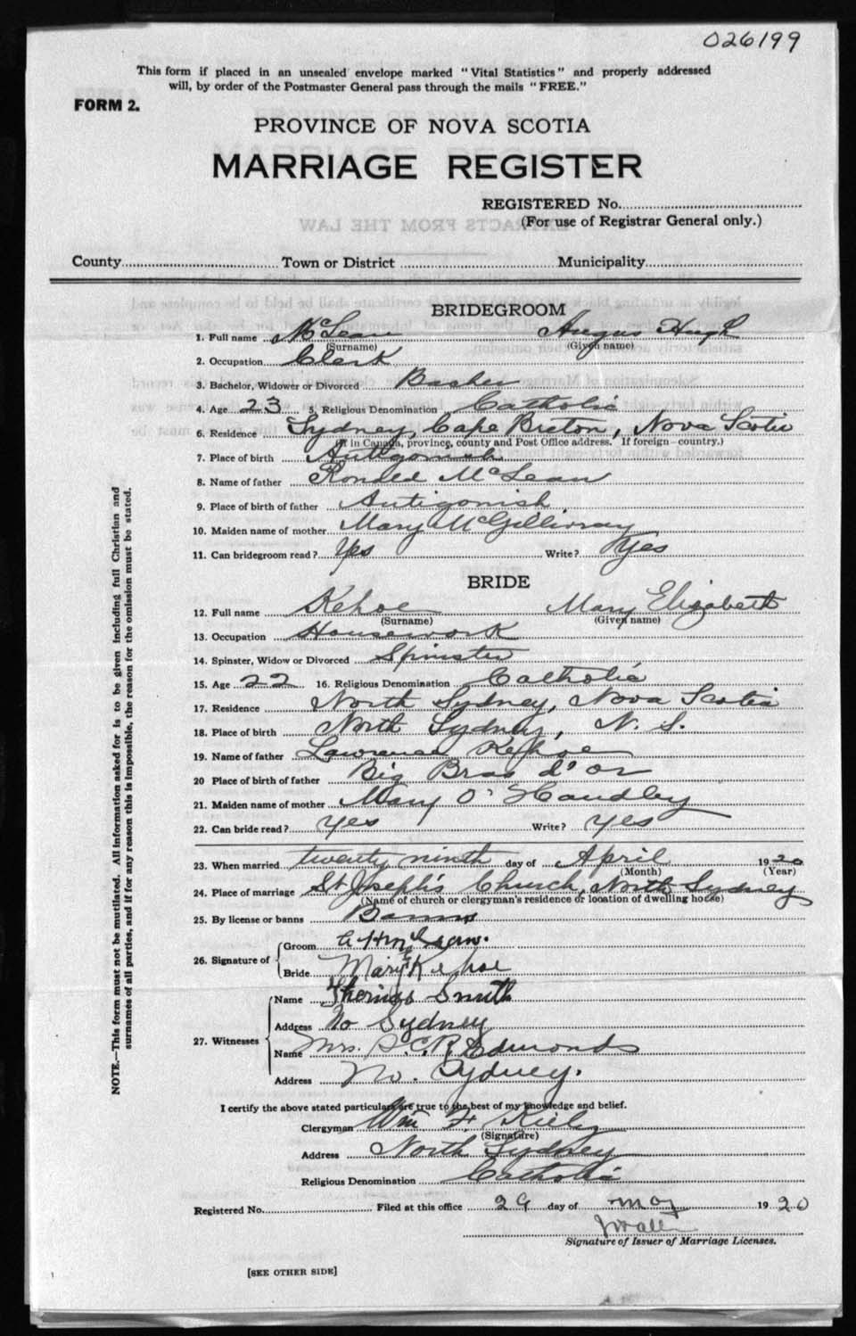 Registration: Year: 1920 number: 26199