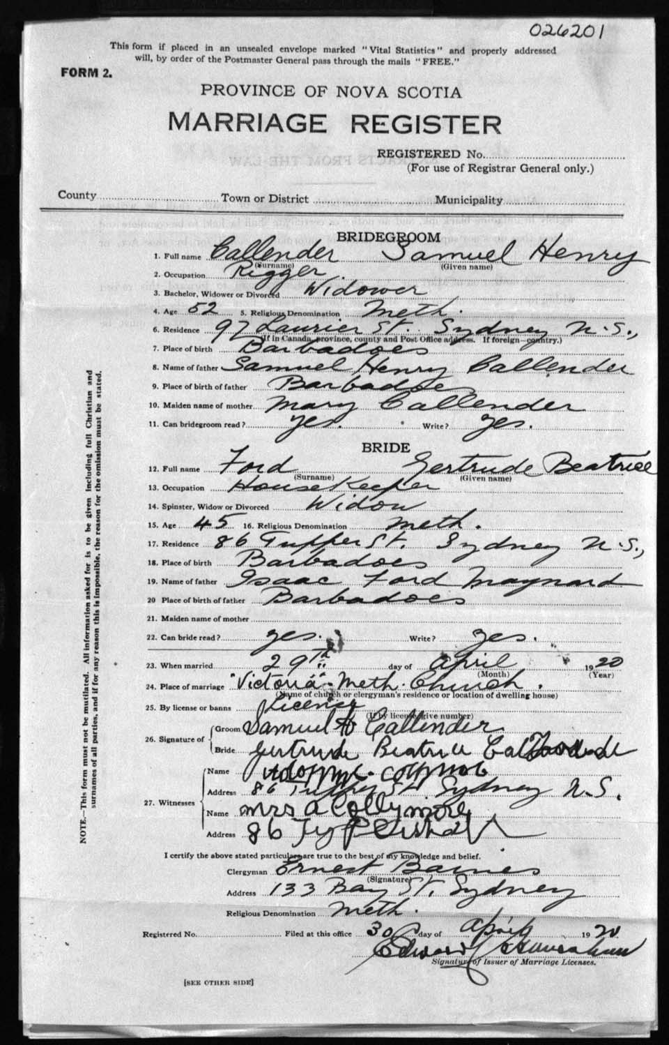 Registration: Year: 1920 number: 26201