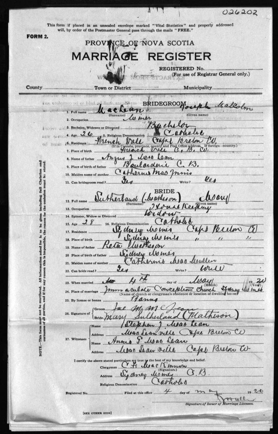 Registration: Year: 1920 number: 26202