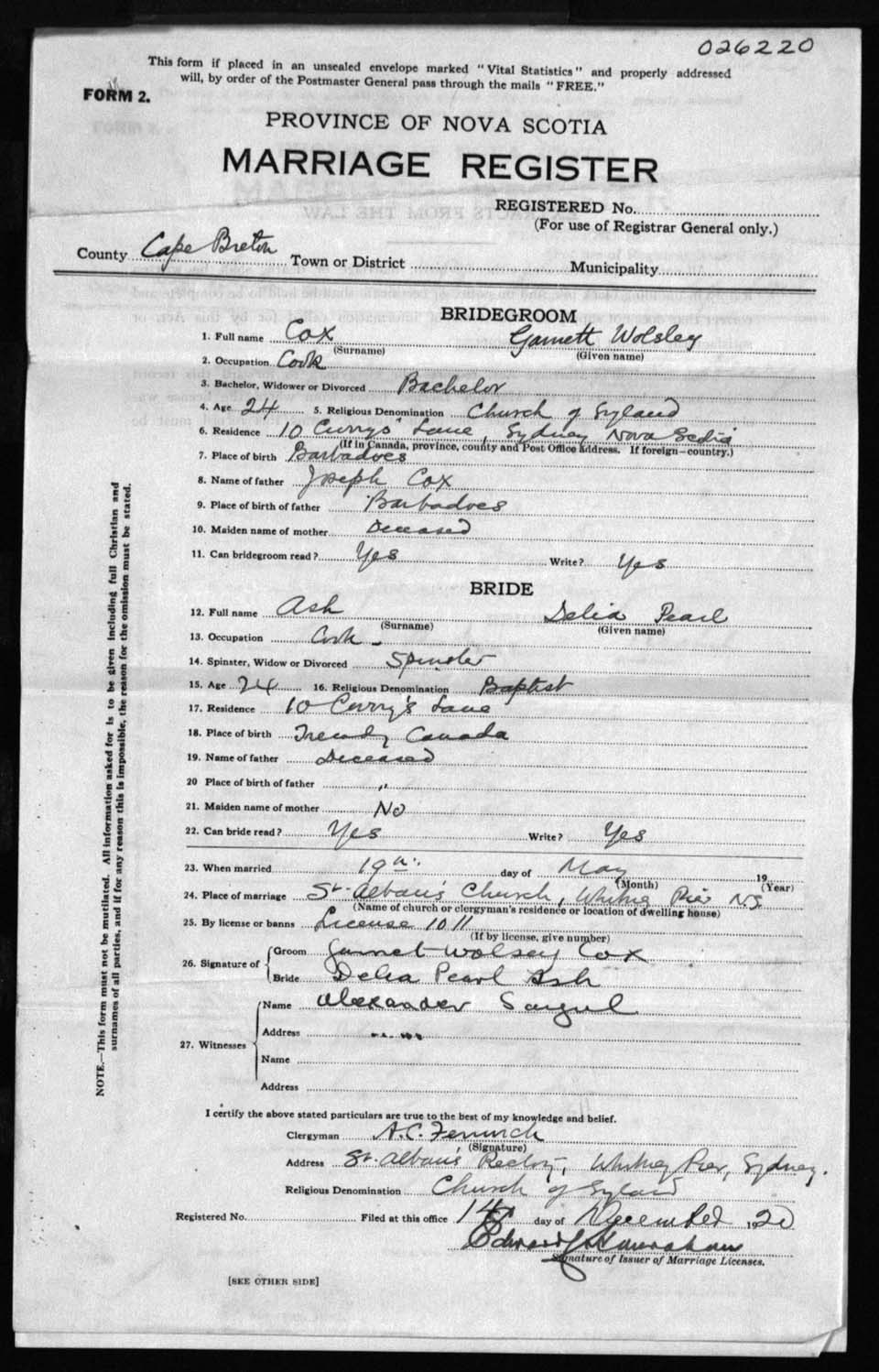 Registration: Year: 1920 number: 26220