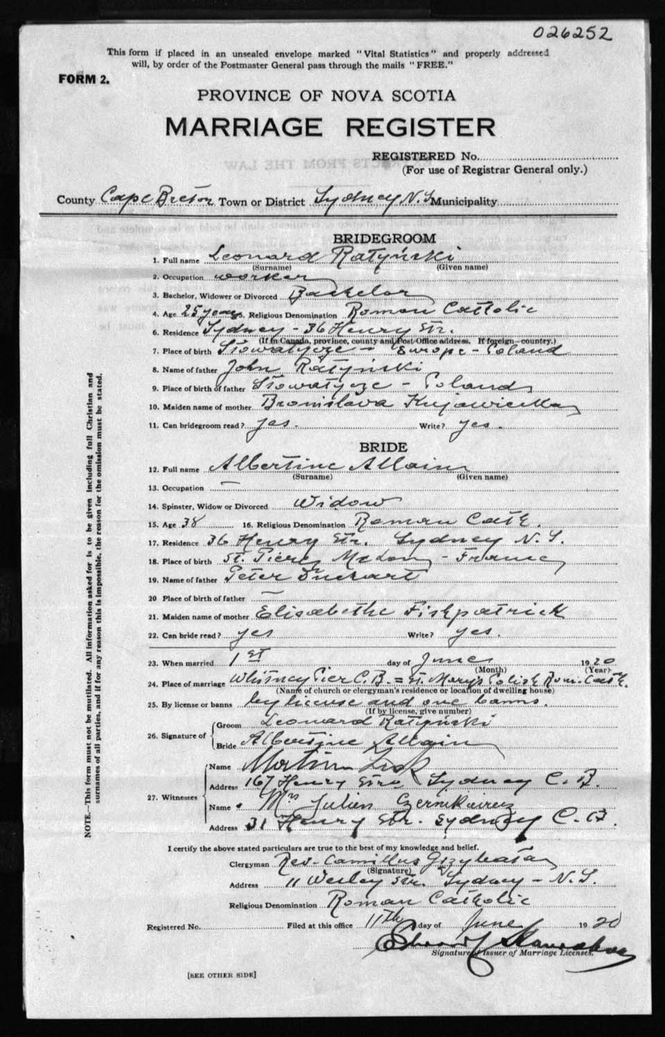 Registration: Year: 1920 number: 26252