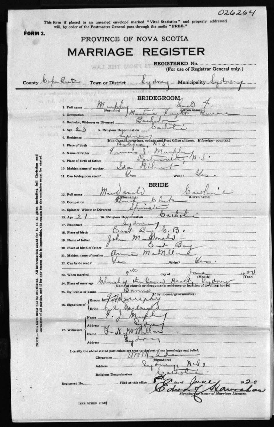 Registration: Year: 1920 number: 26264