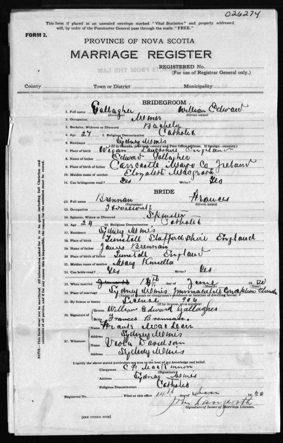 Registration: Year: 1920 number: 26274