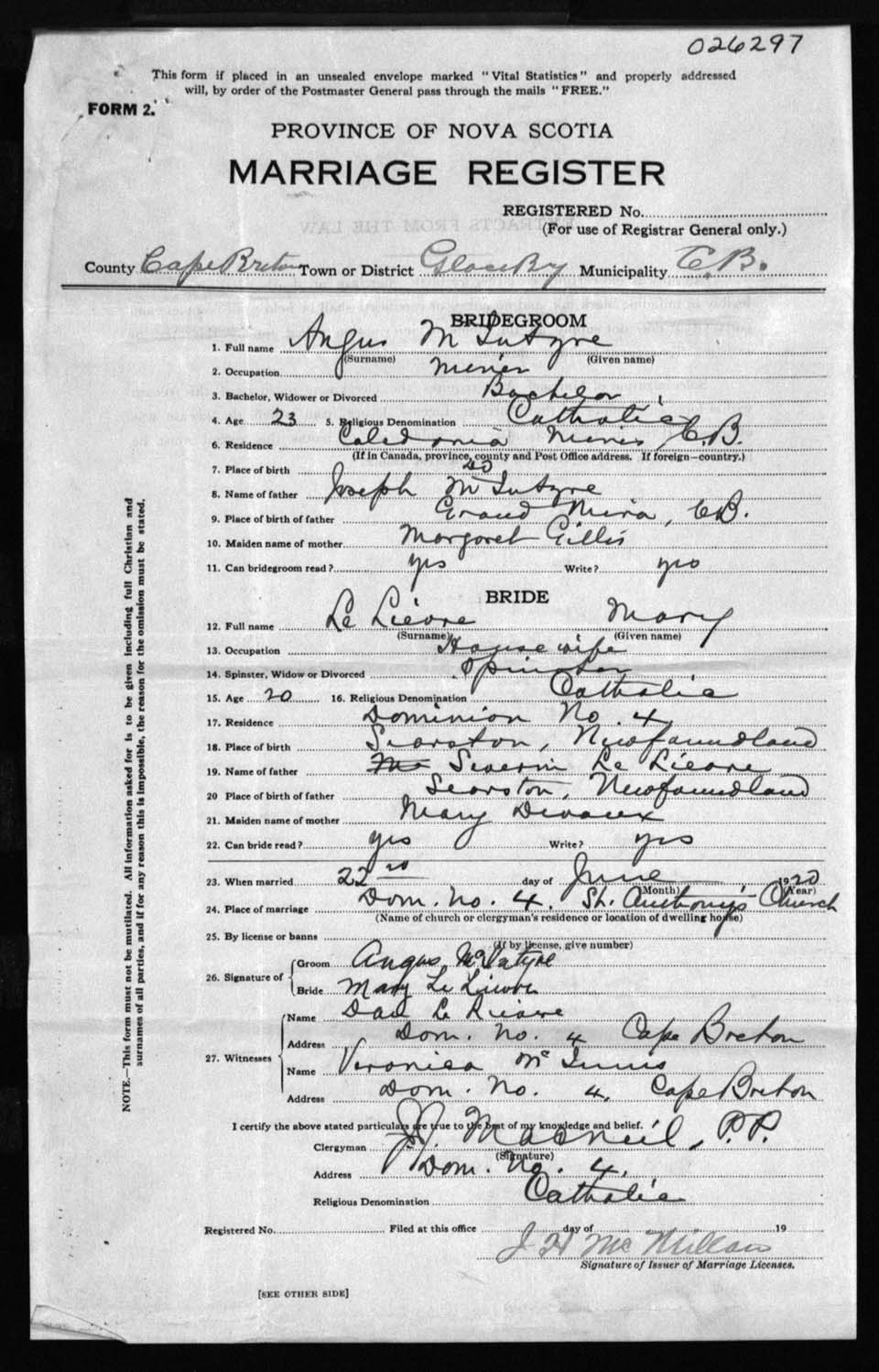 Registration: Year: 1920 number: 26297