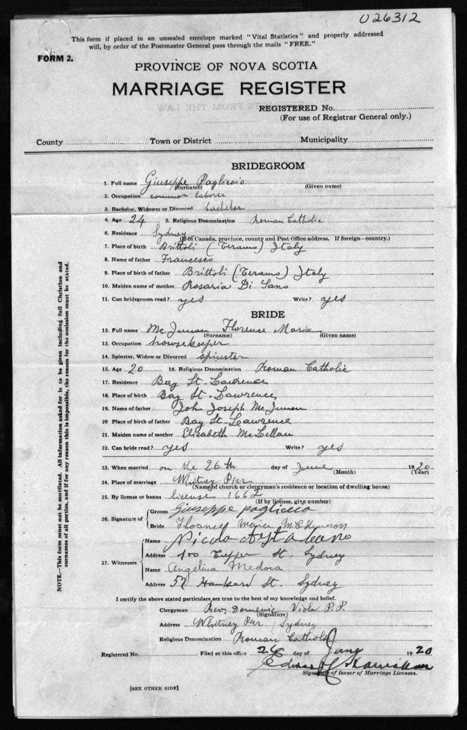 Registration: Year: 1920 number: 26312