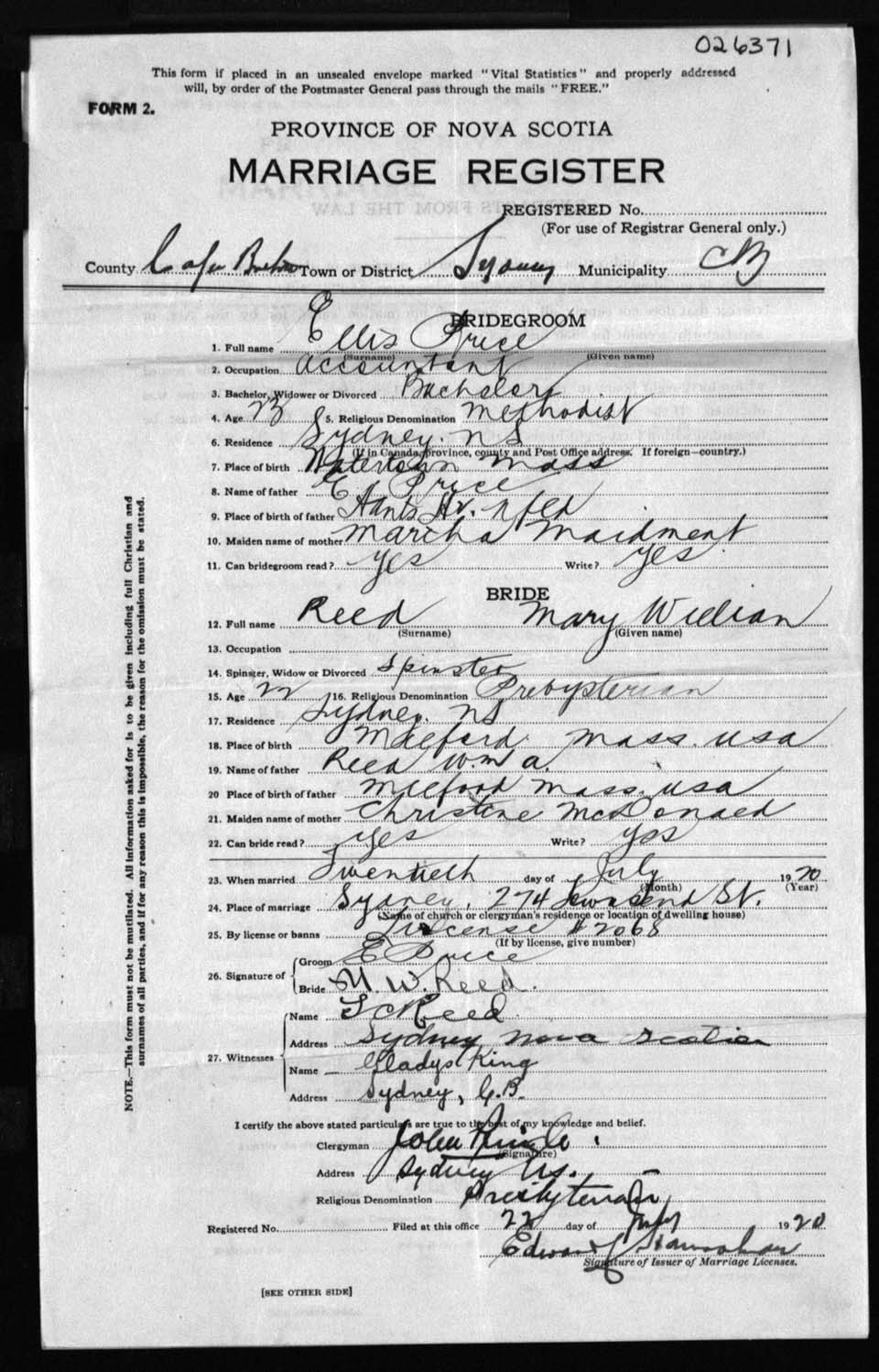 Registration: Year: 1920 number: 26371