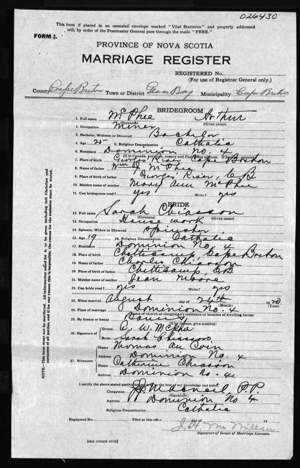 Registration: Year: 1920 number: 26430