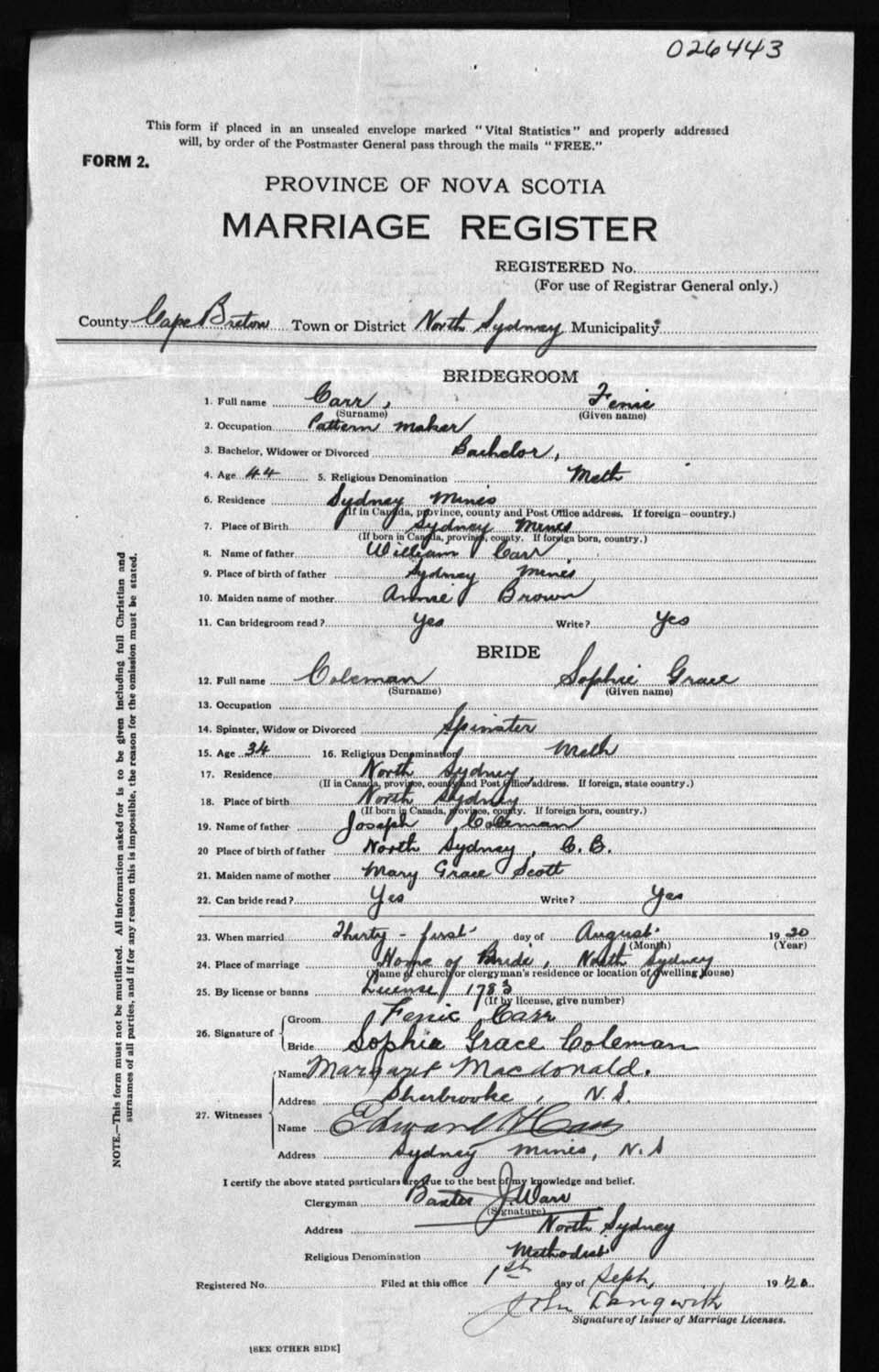 Registration: Year: 1920 number: 26443