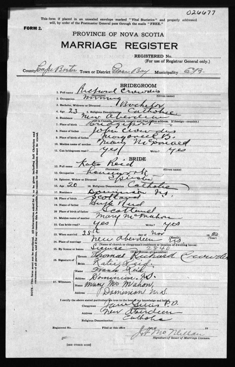 Registration: Year: 1920 number: 26677