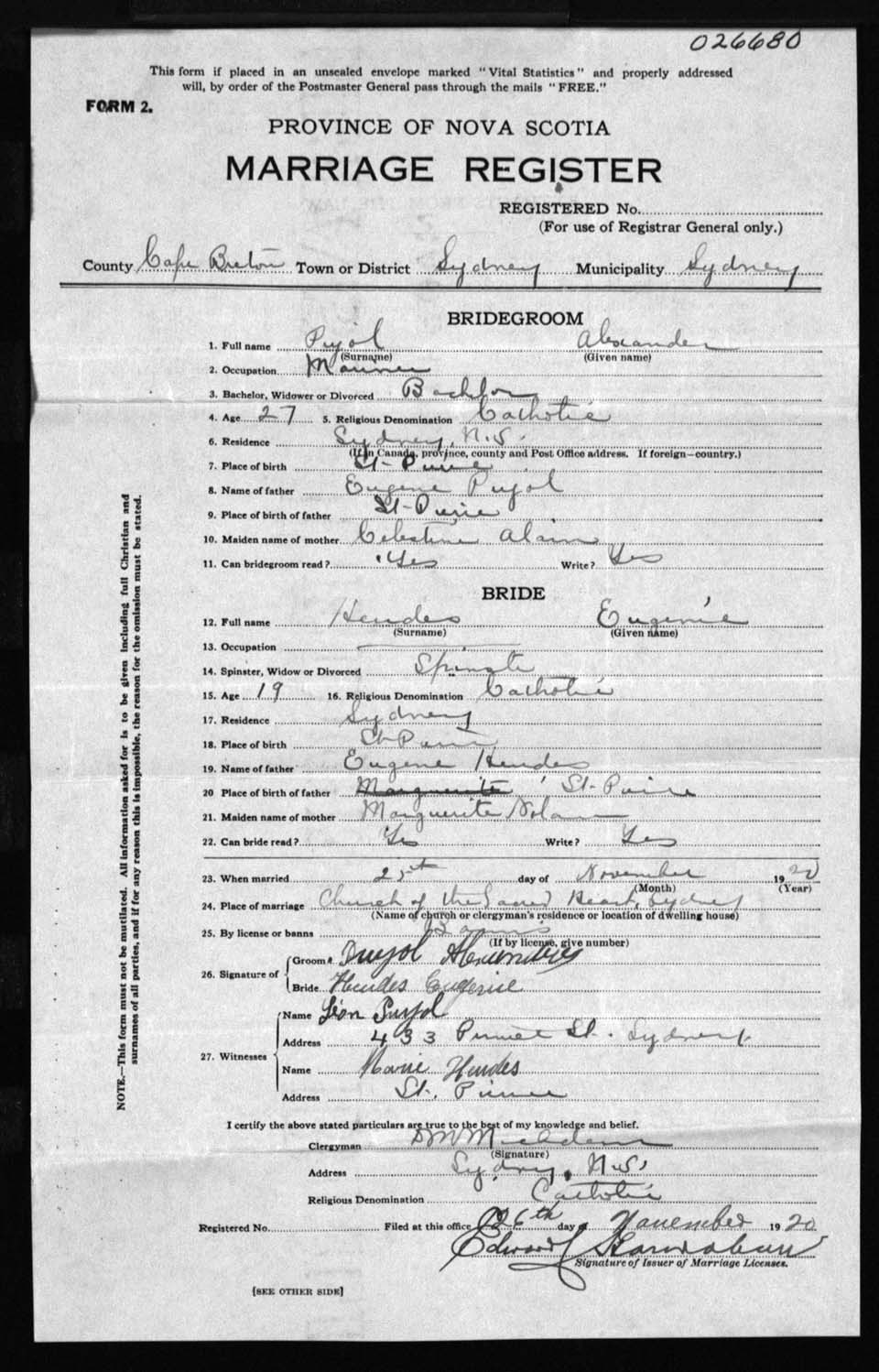 Registration: Year: 1920 number: 26680