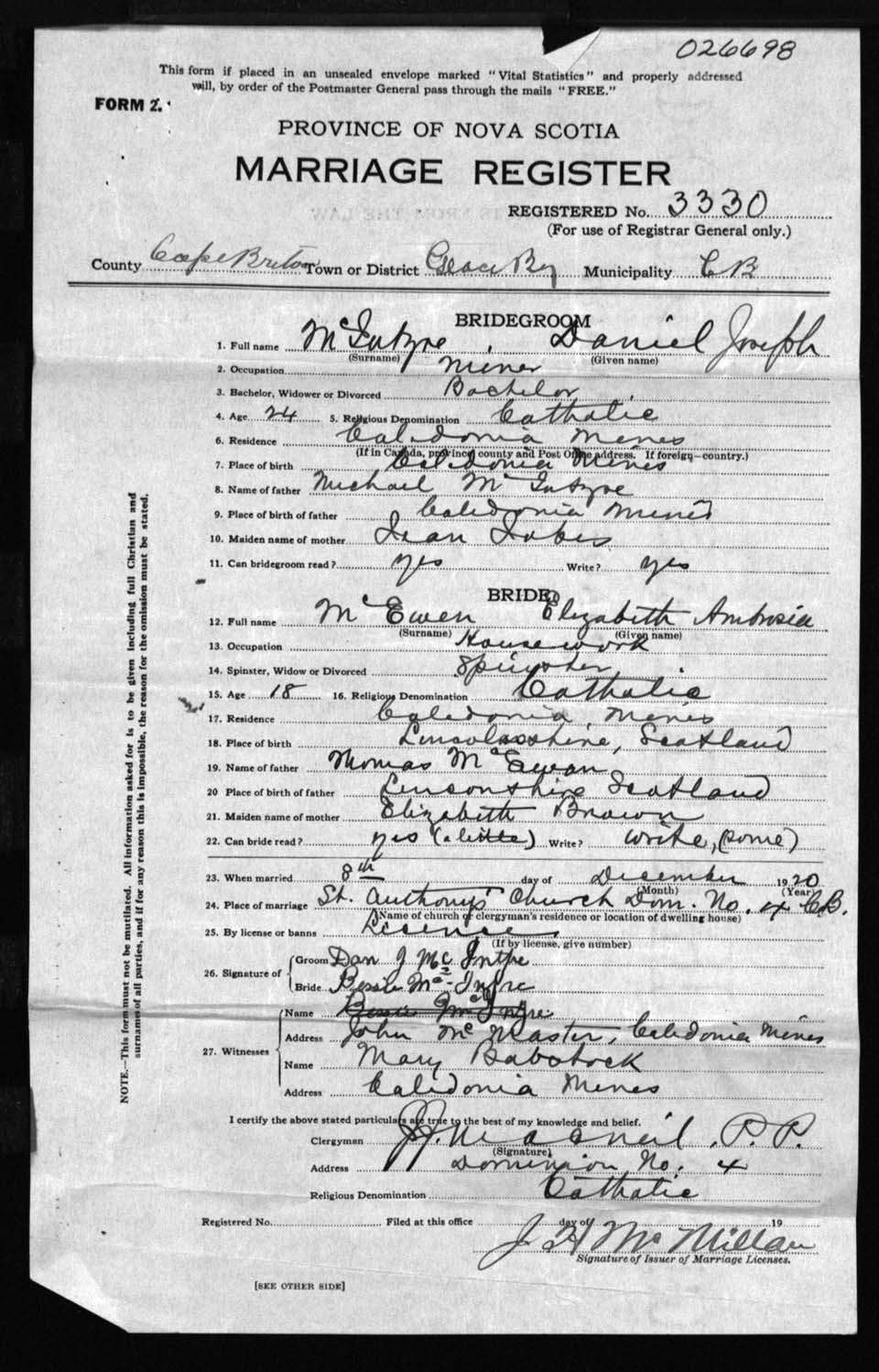 Registration: Year: 1920 number: 26698
