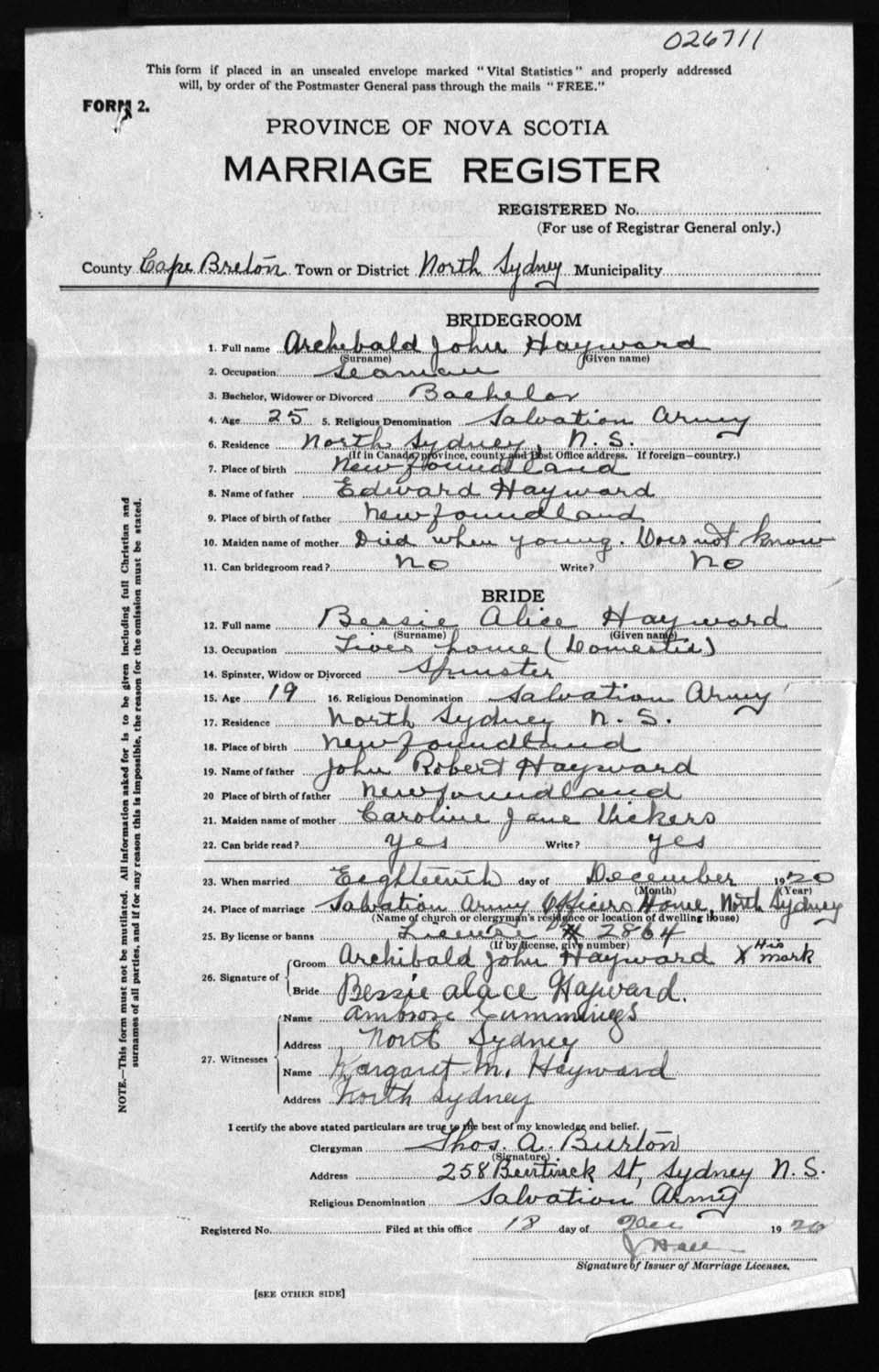 Registration: Year: 1920 number: 26711