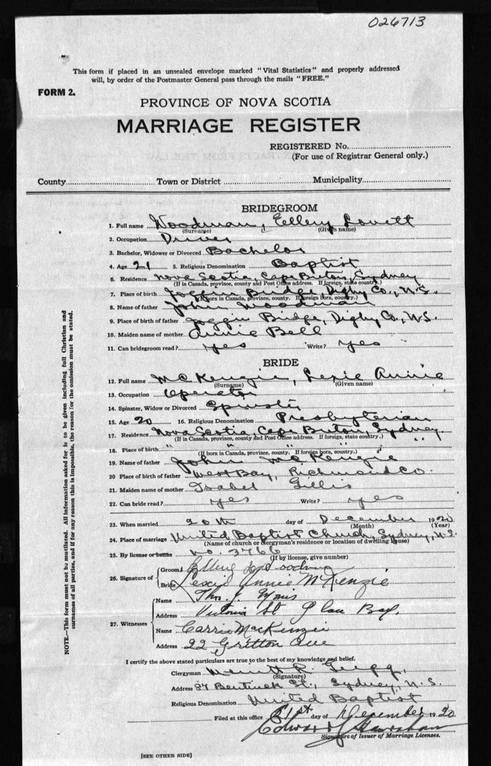 Registration: Year: 1920 number: 26713