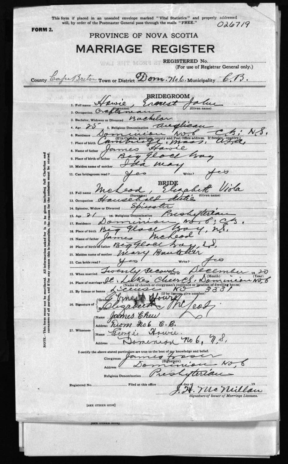 Registration: Year: 1920 number: 26719