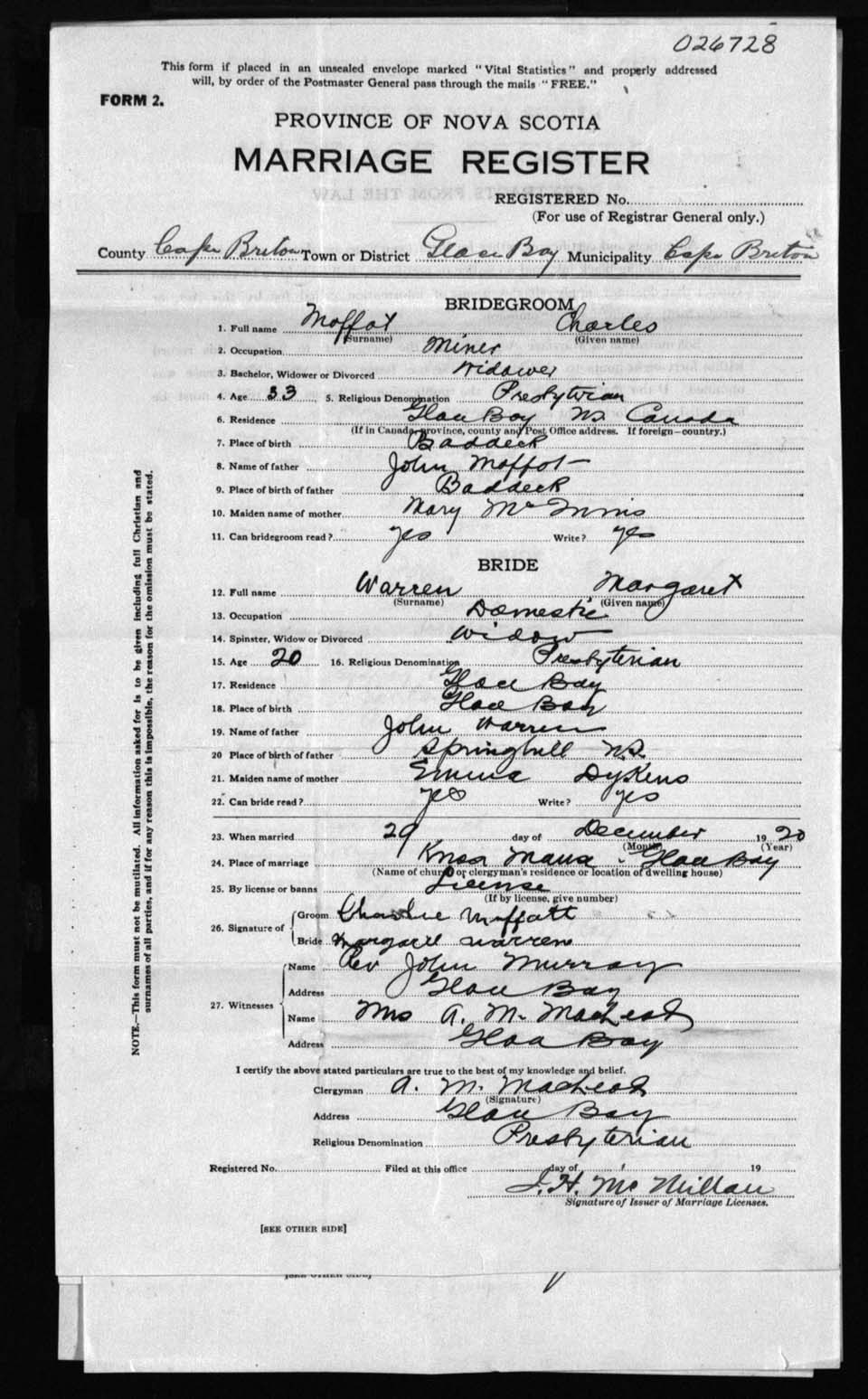 Registration: Year: 1920 number: 26728