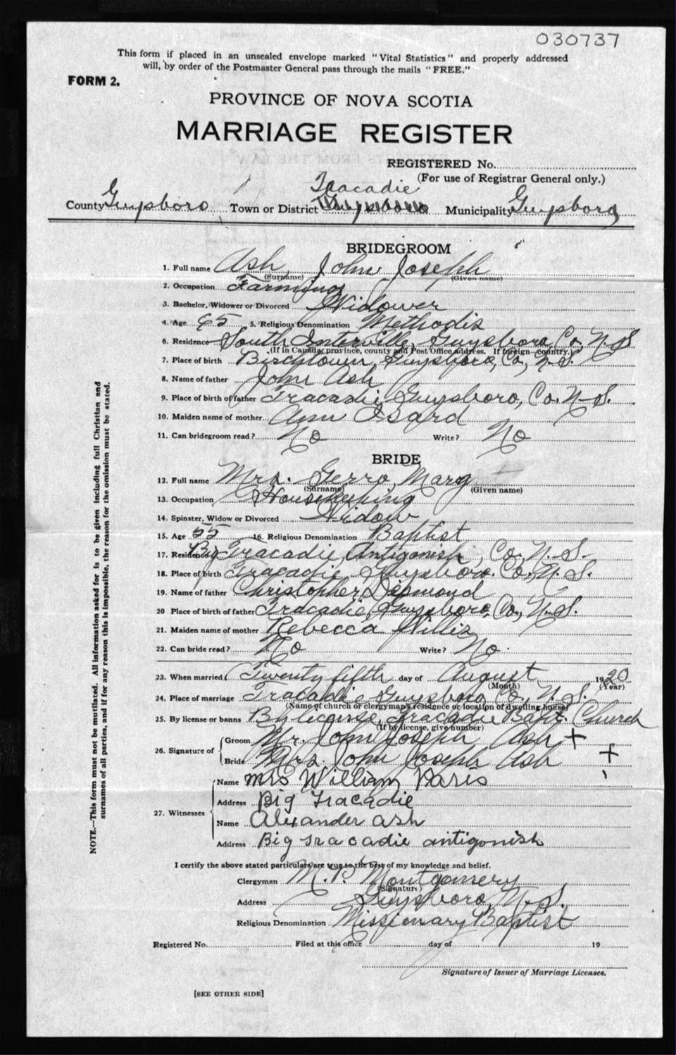 Registration: Year: 1920 number: 30737