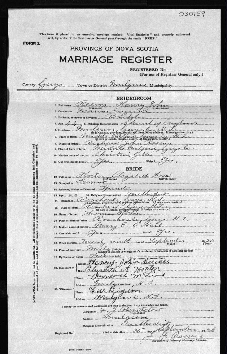 Registration: Year: 1920 number: 30759