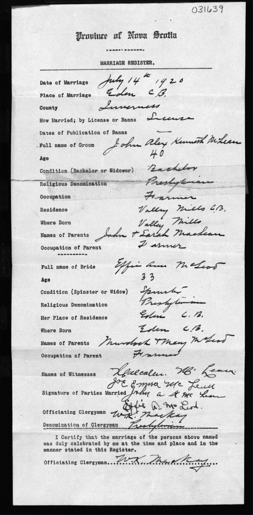 Registration: Year: 1920 number: 31639
