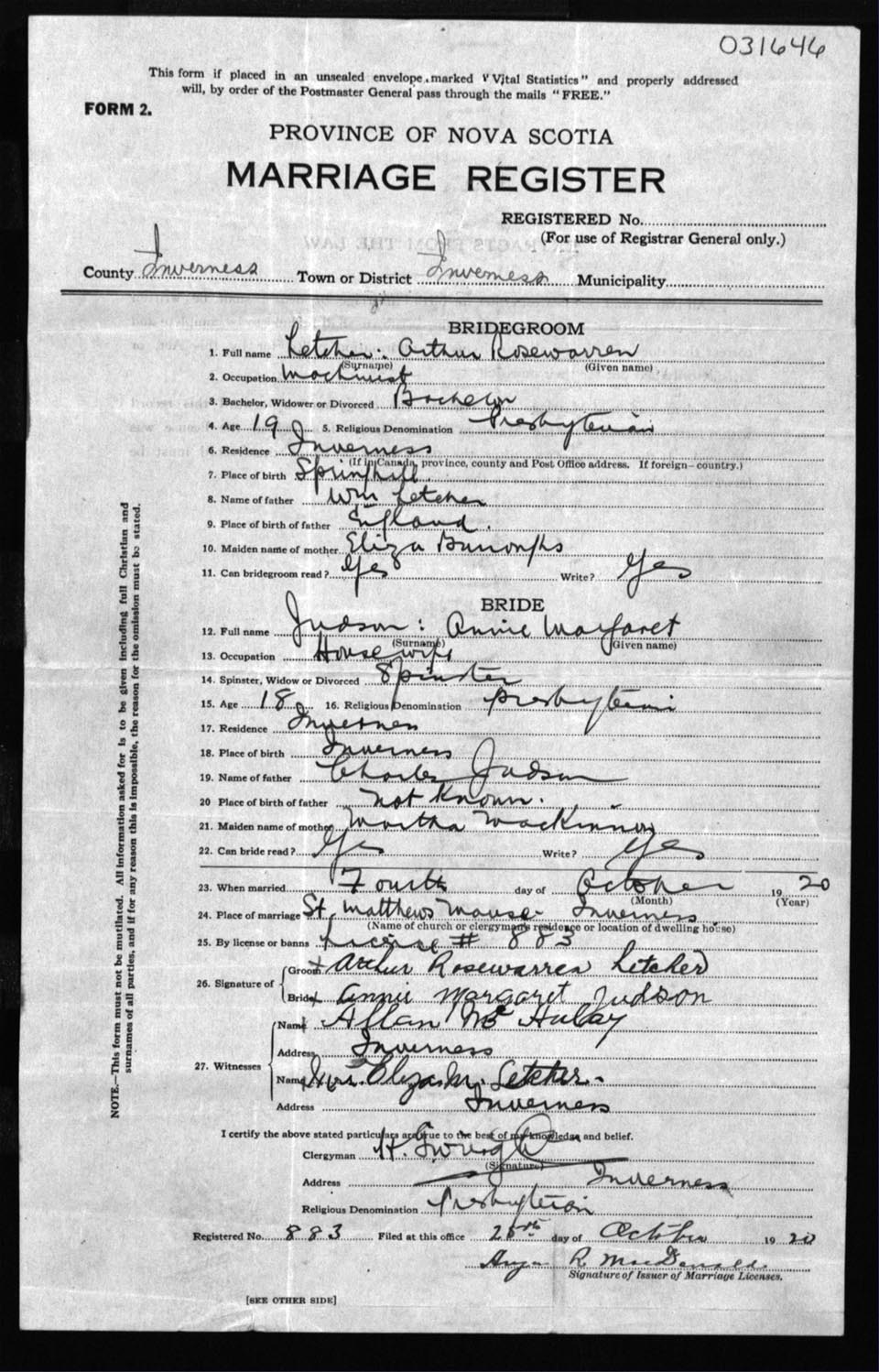 Registration: Year: 1920 number: 31646