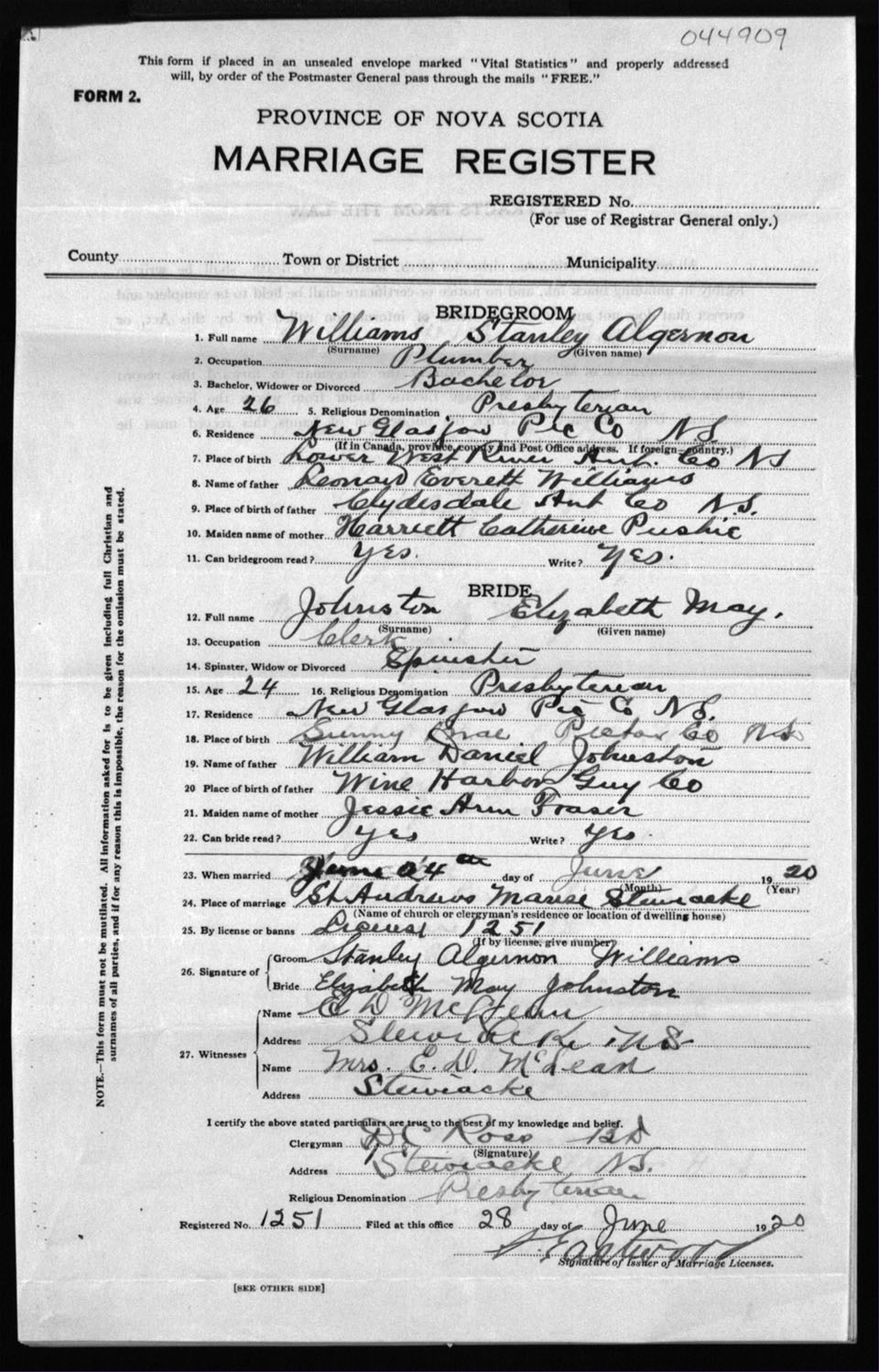 Registration: Year: 1920 number: 44909