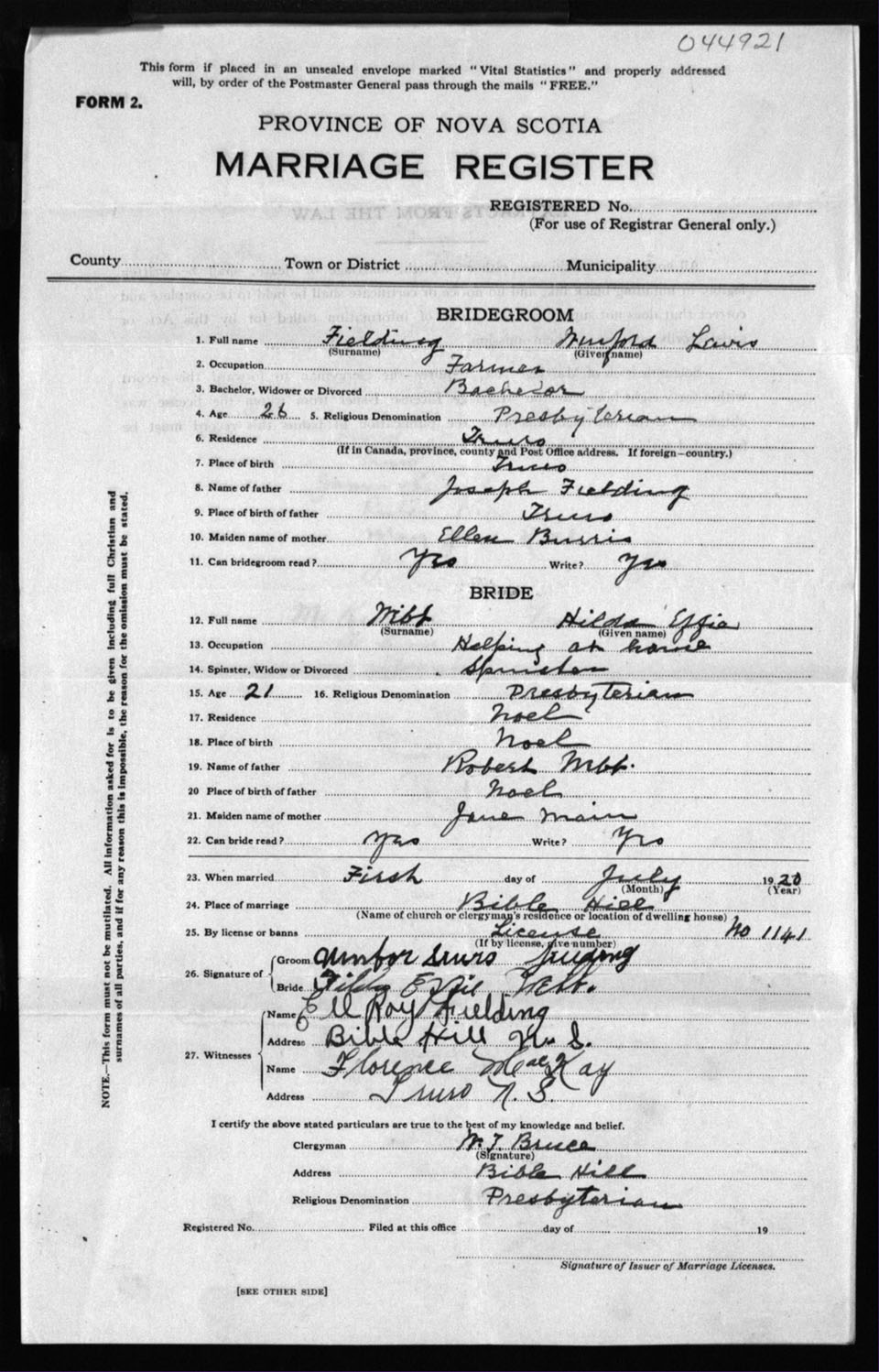 Registration: Year: 1920 number: 44921