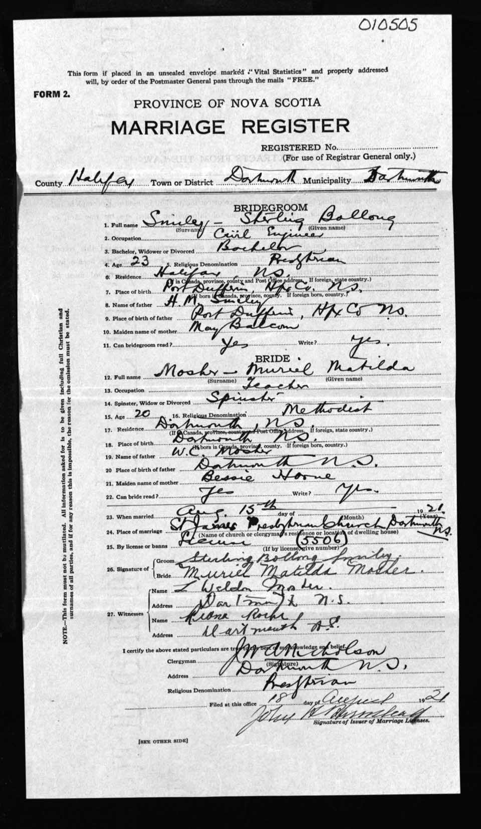 Registration: Year: 1921 number: 10505