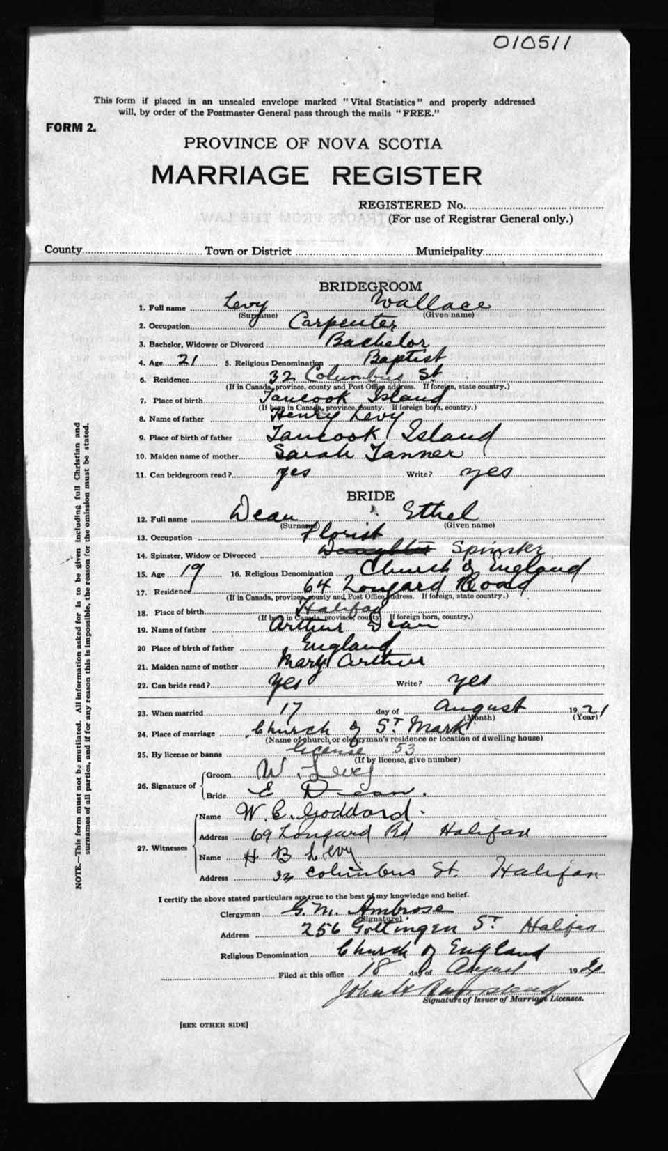 Registration: Year: 1921 number: 10511