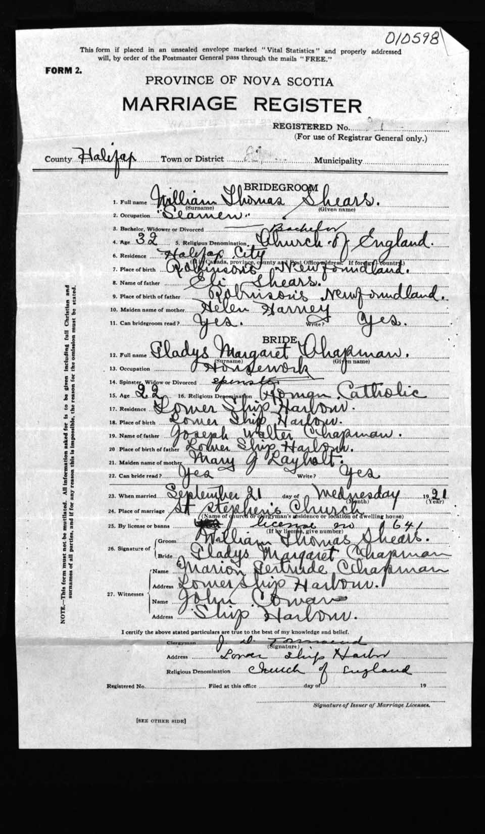 Registration: Year: 1921 number: 10598