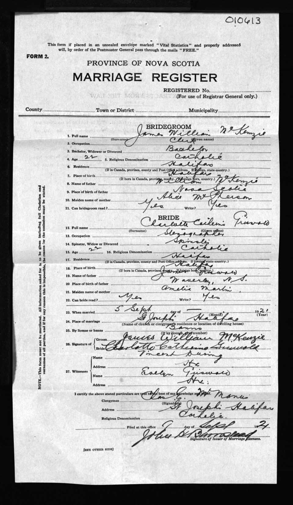 Registration: Year: 1921 number: 10613