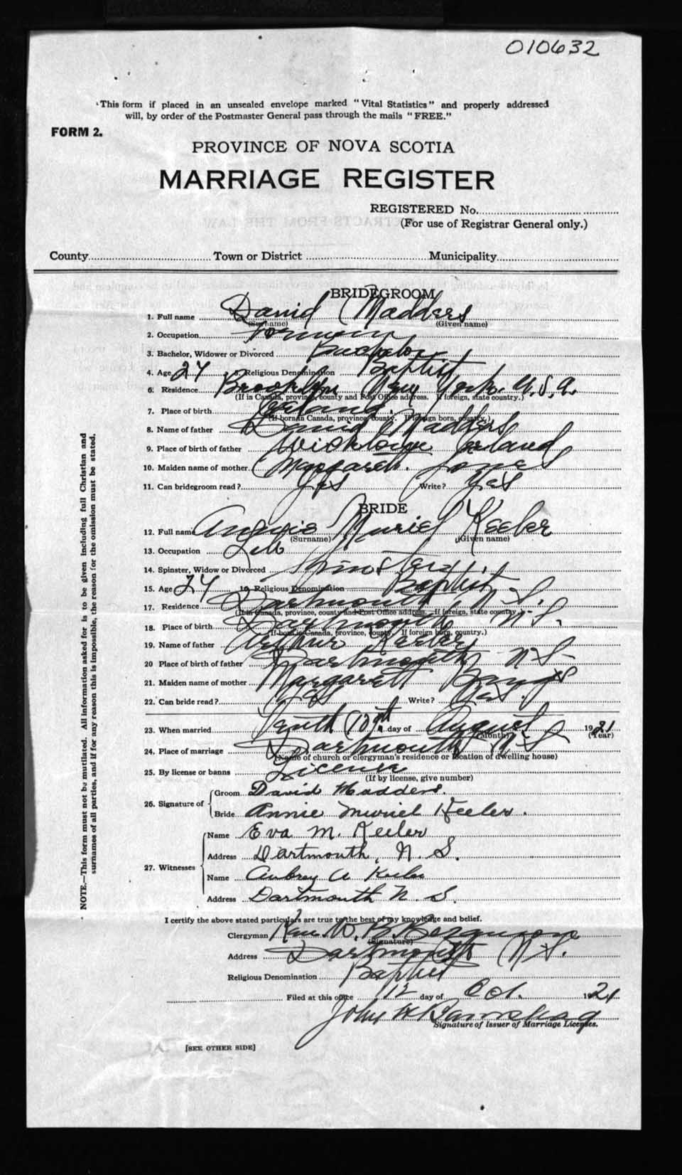 Registration: Year: 1921 number: 10632