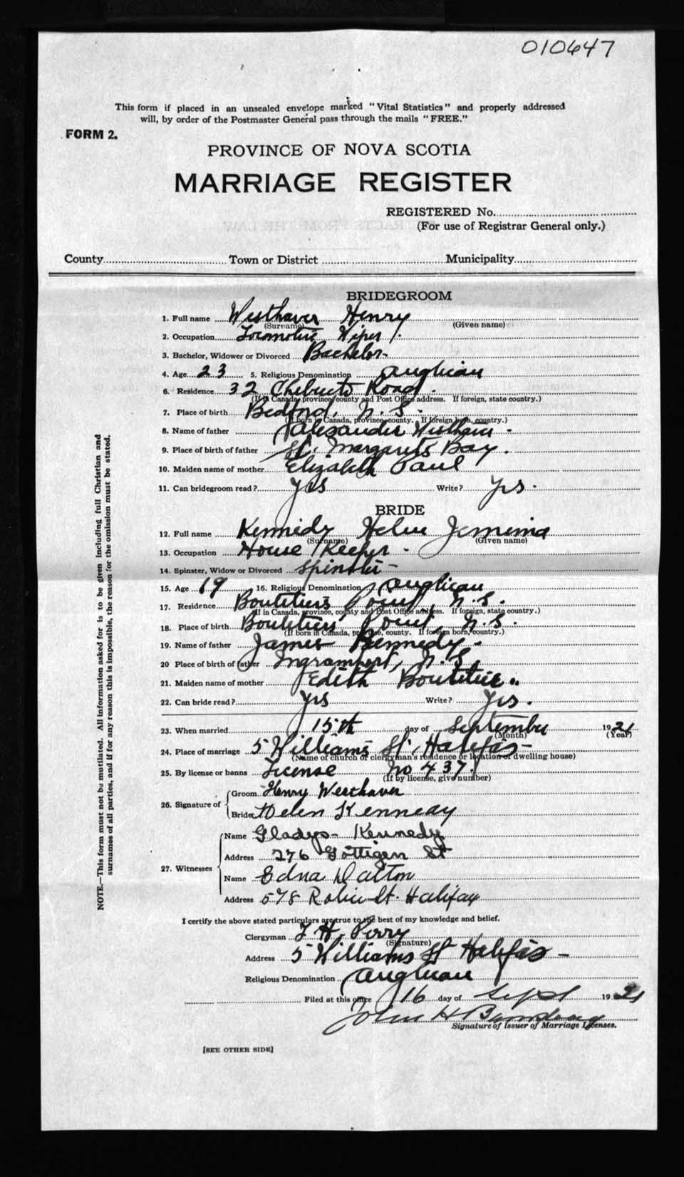 Registration: Year: 1921 number: 10647