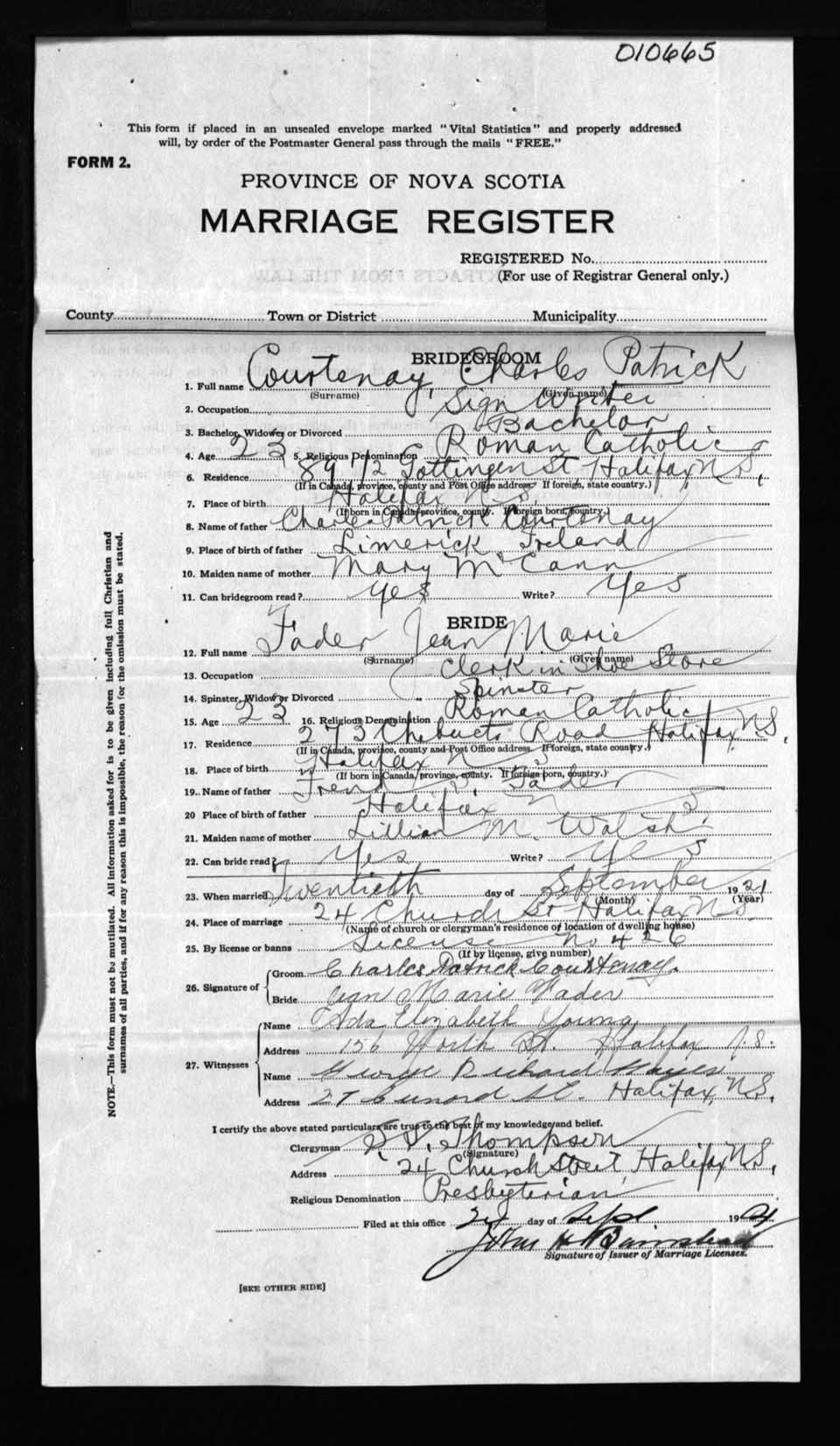 Registration: Year: 1921 number: 10665