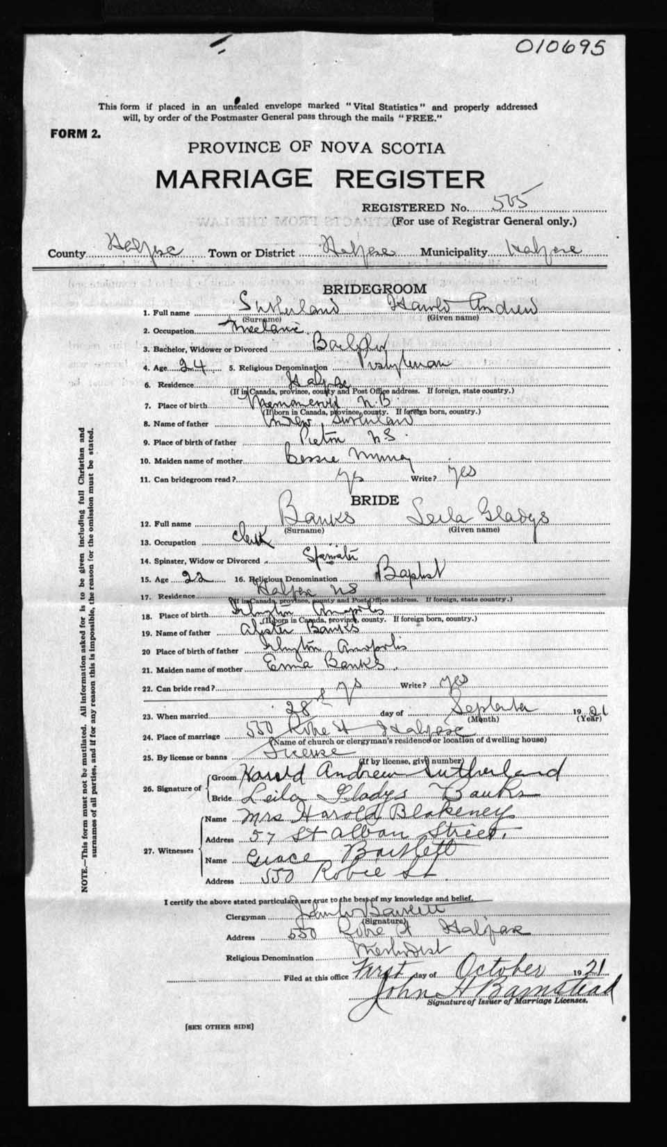 Registration: Year: 1921 number: 10695