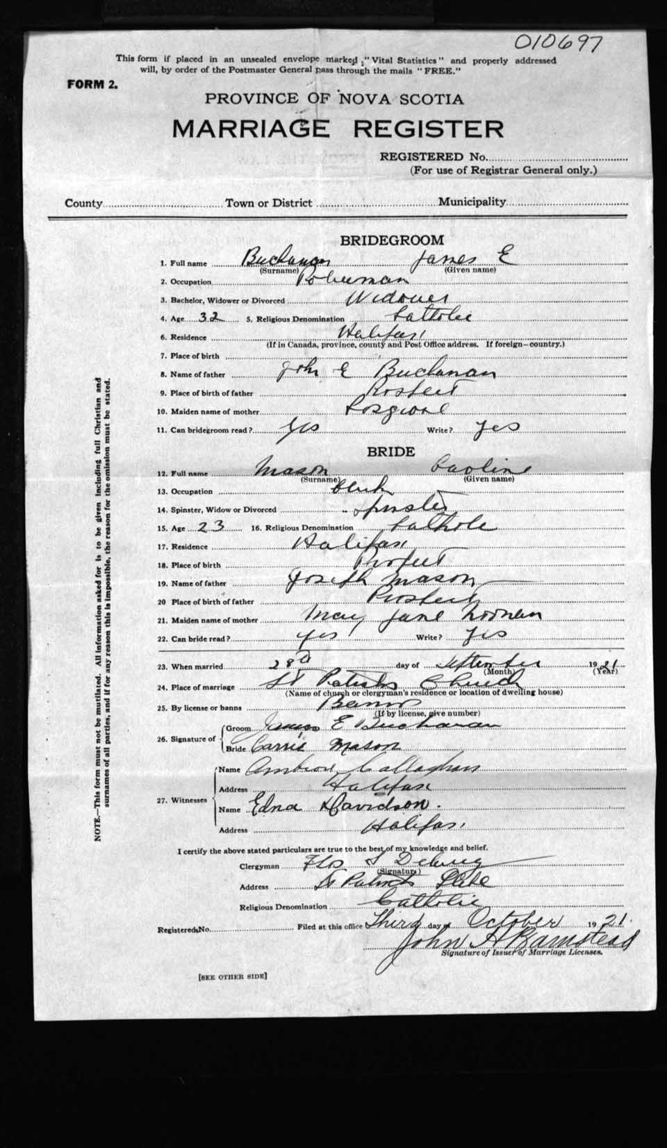Registration: Year: 1921 number: 10697