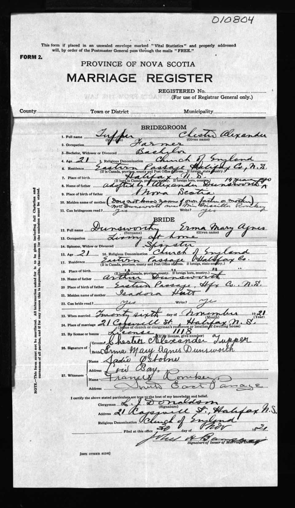 Registration: Year: 1921 number: 10804